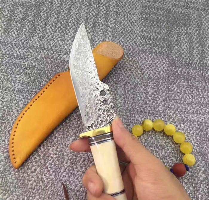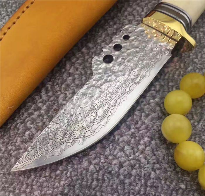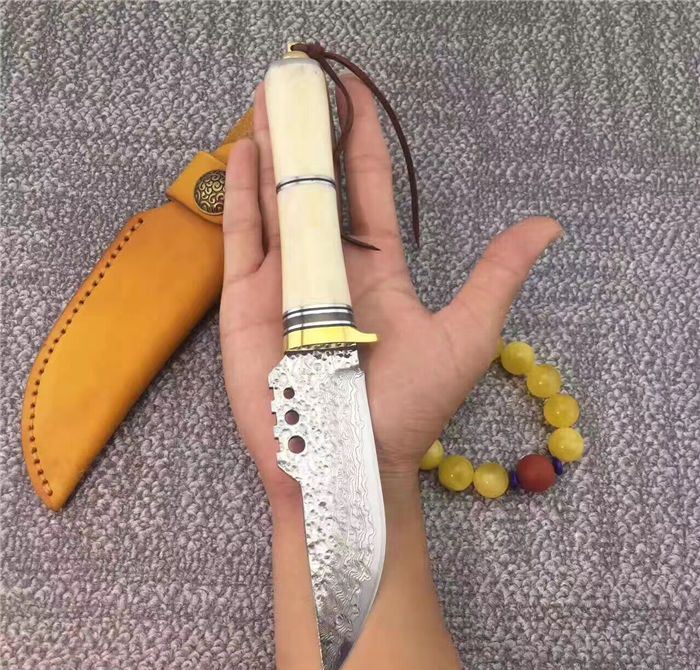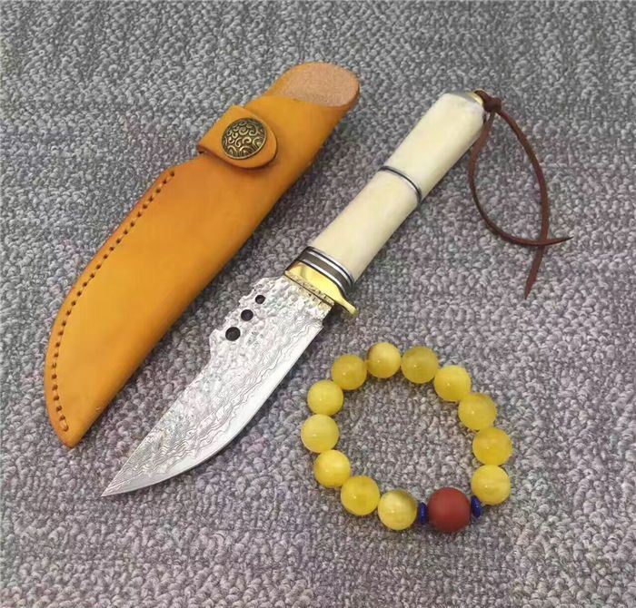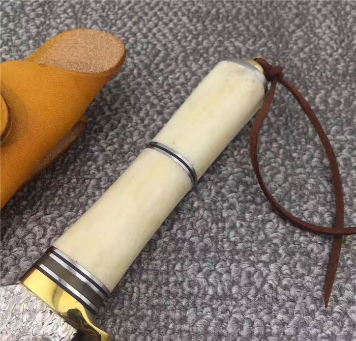 大马士革战争鳄鱼直刀 总长:约23.5cm 刃长:约11.5cm 刃厚:约0.4cm 刃宽:约3.5cm(最宽处) 柄长:约12cm 刃材:进口VG10钢芯大马士革钢 手柄材质:纯黄铜护手+天然羊骨+G10片+纯黄铜尾部 制作工艺:真空热处理、水冷二次开刃 刀鞘:意大利进口优质植鞣皮,纯手工缝线 包装:高档礼品硬盒