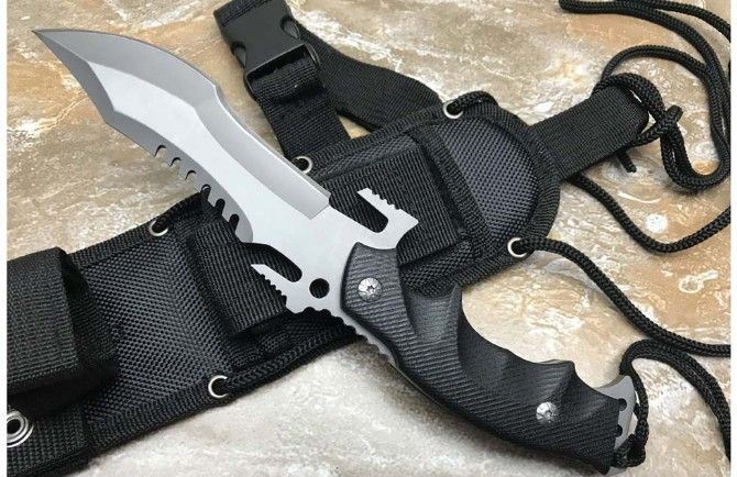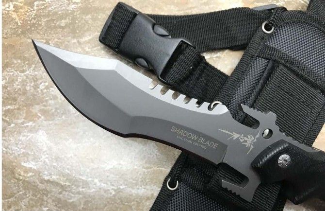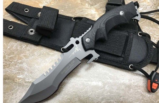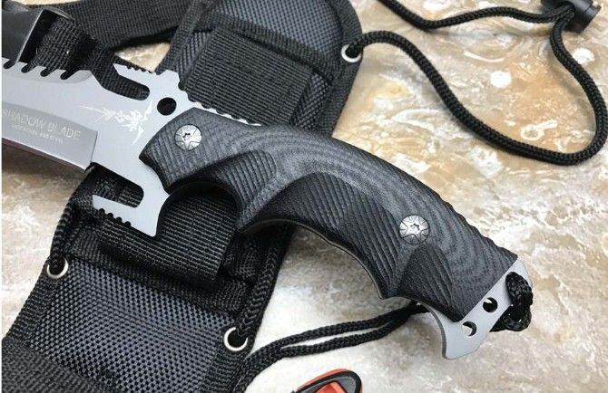 影子之刃三叉直刀 刀刃材质:8Cr17Mov 全长:25.0CM 刃长:12.4CM 刃厚:0.49CM 刃宽:3.2CM 硬度:58HRC 柄材:G10 重量:483克 刀鞘:黑色尼龙战术绑腿刀鞘 附件:纸盒 哨子