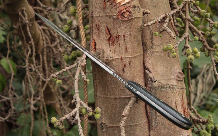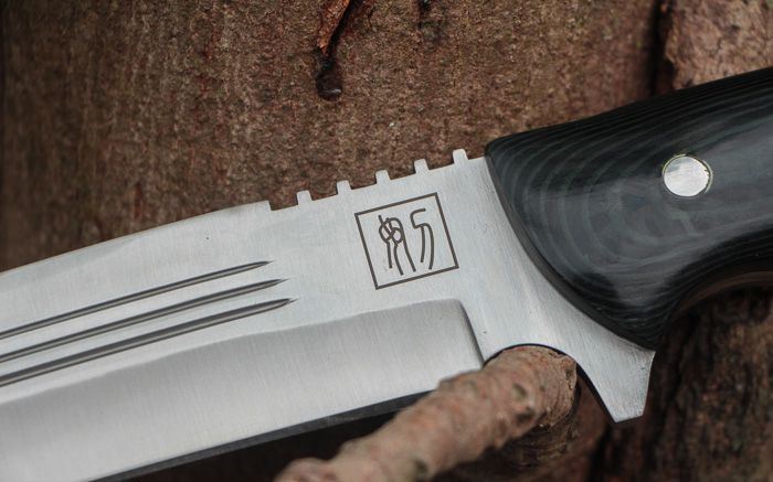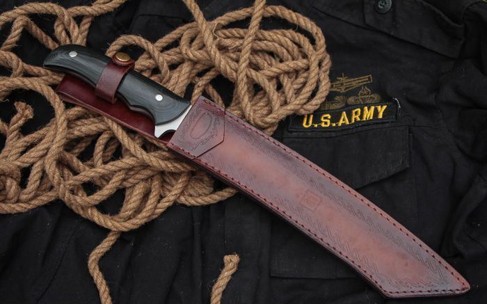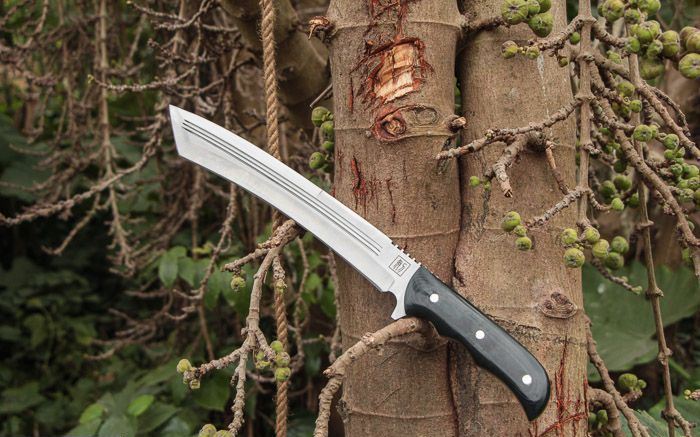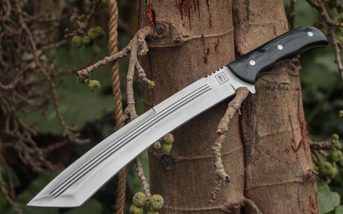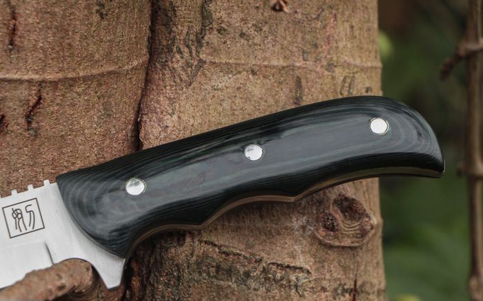 柄 材: 刀身贯穿刀柄,三口坚实的钢钉铆住两面黑木