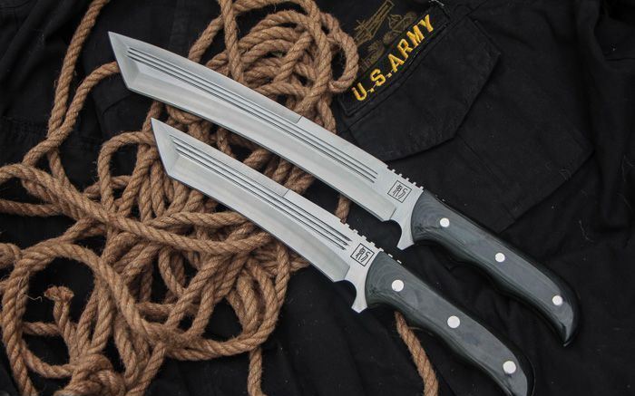 刀奴4加长版 全 长: 45cm 刃 长: 29 刃 宽: 4.1cm(最宽处) 柄 长: 16cm 刃 厚: 0.72cm 刃 材: 440 硬 度: 57RHC 表 面: 丝光 柄 材: 刀身贯穿刀柄,三口坚实的钢钉铆住两面黑木 净 重: 960克(含套)