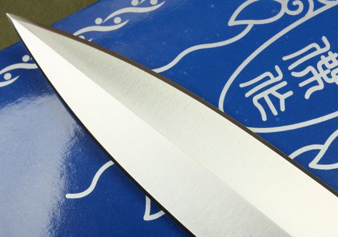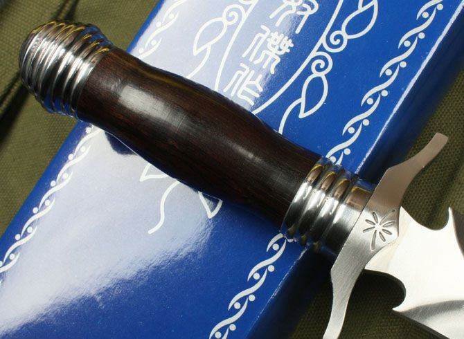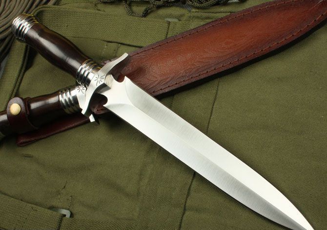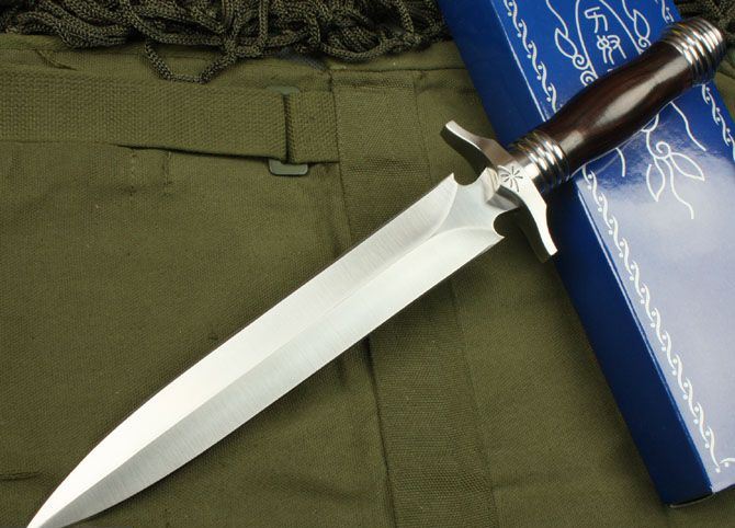 刀奴螺旋双锋(中号) 全长:36.5cm 刃长:23.5cm 柄长:13cm 刃厚:6.9mm 刃宽: 3cm 刃材: 5Cr13 柄材: 黑檀木 硬度: 57HRC 净重:580克 毛重:680克 表面处理: 手工砂光