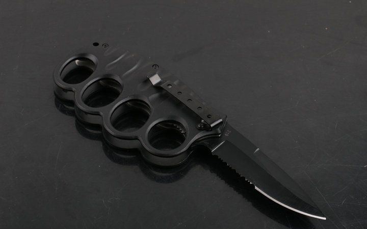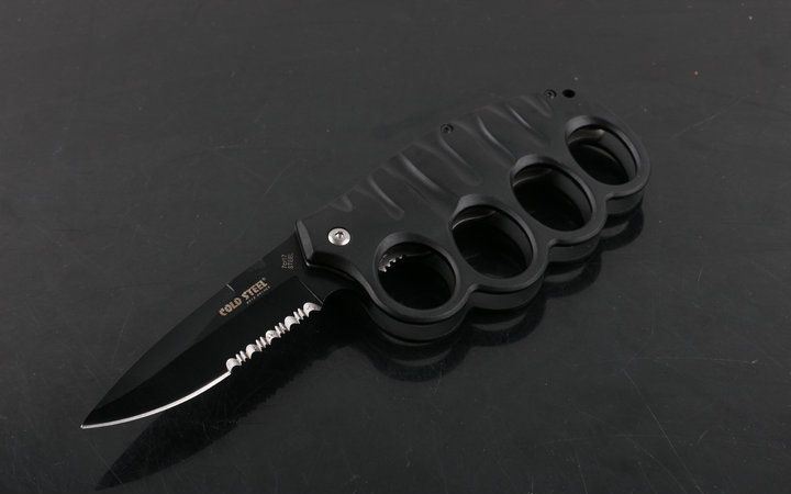 冷钢219半齿拳套折刀 全 长:20cm 刃 长:8.5cm 柄 长:11cm 刃 厚:0.28cm 刃 材:7Cr17 柄 材:铝 硬 度:58HRC 表 面:氧化黑 重 量:170g