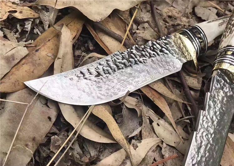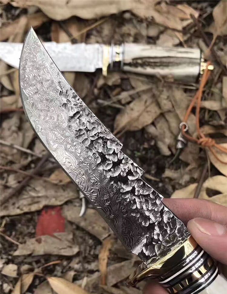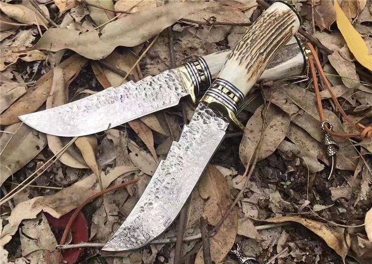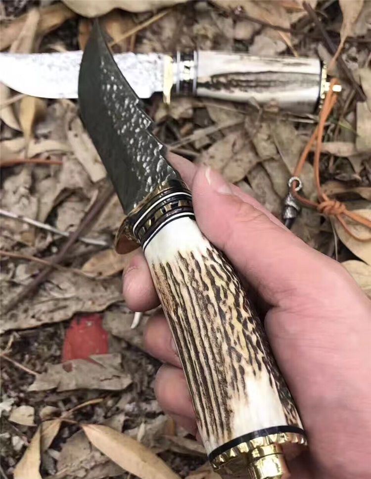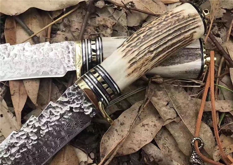 翼龙鹿角大马士革猎刀 刃材:大马士革钢 硬度:59-60HRC 全长:25.5cm 刀刃:长13cm 手柄:12.5cm 刃厚:4.2mm 柄材:白钢护手+G10黑+黄铜隔片+黄檀木、雄狮柳钉固定 刀柄吊坠彩体轮珠 配真牛皮手工刀套 礼品盒包装