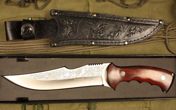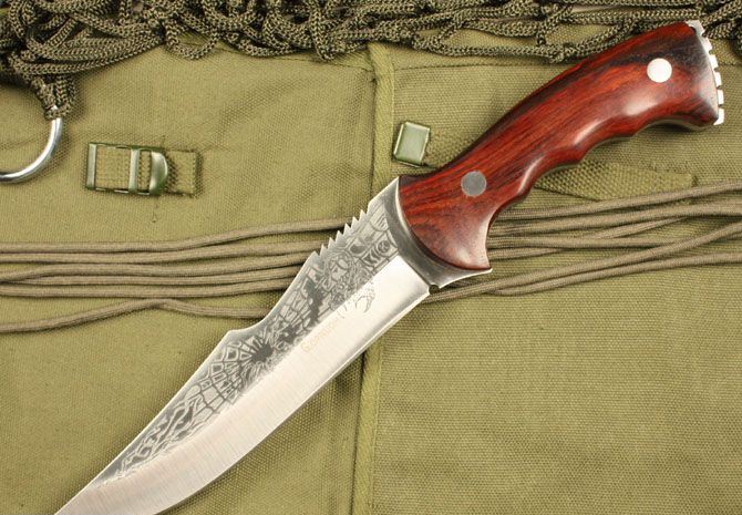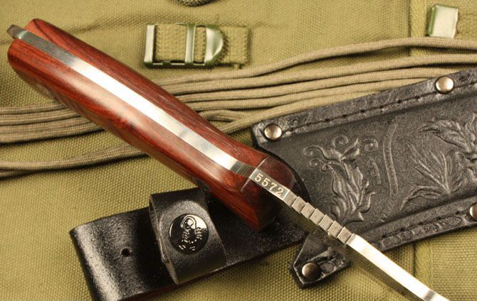 刀奴蝎子王 全长:32.5cm 刃长:18cm 刃宽:4cm (最宽处) 刃厚:0.48cm 柄长:13.5cm 刃材:5Cr15MoV 硬度:57HRC 刀重:400克 总重:580克(含包装物) 柄材:红檀
