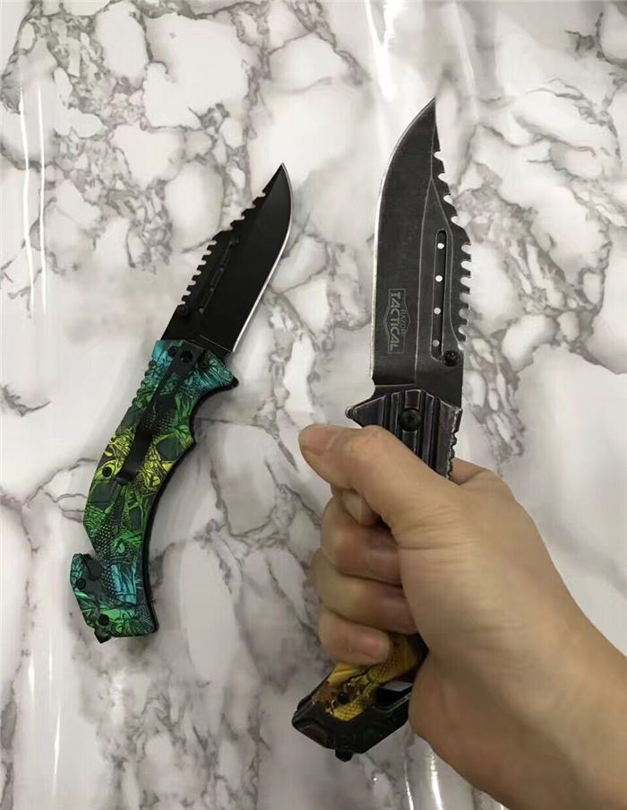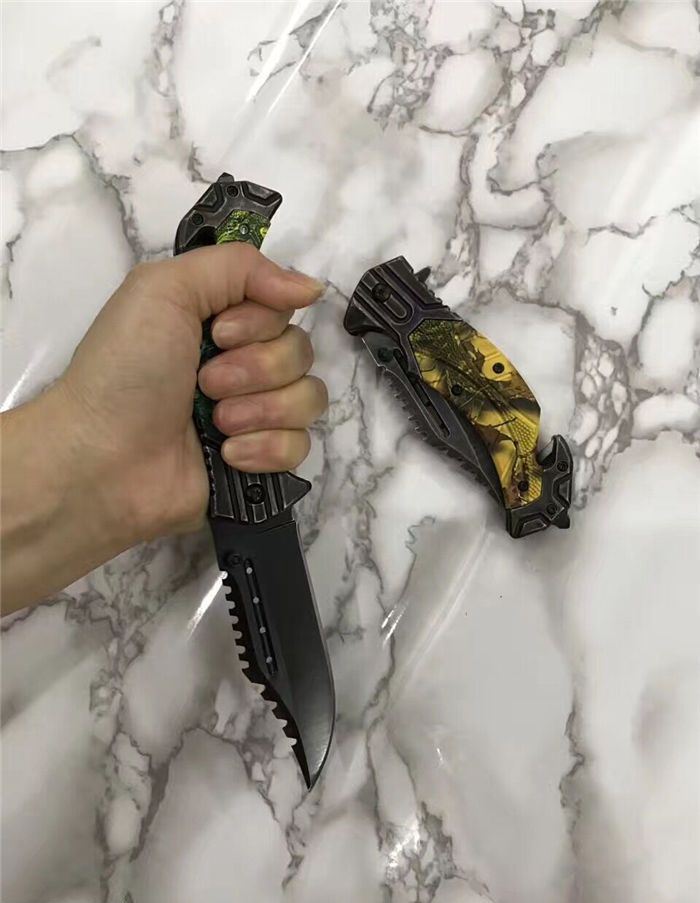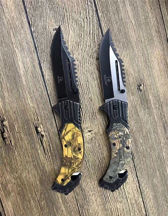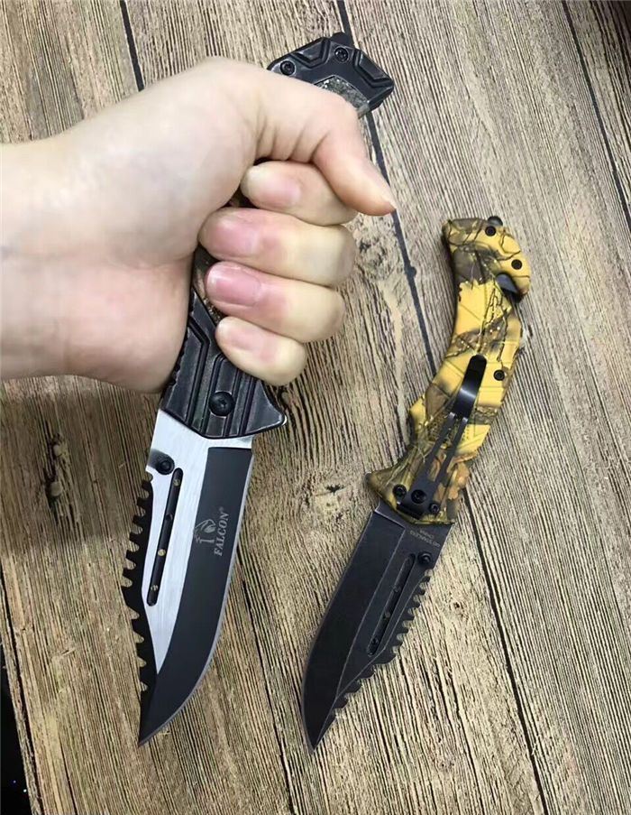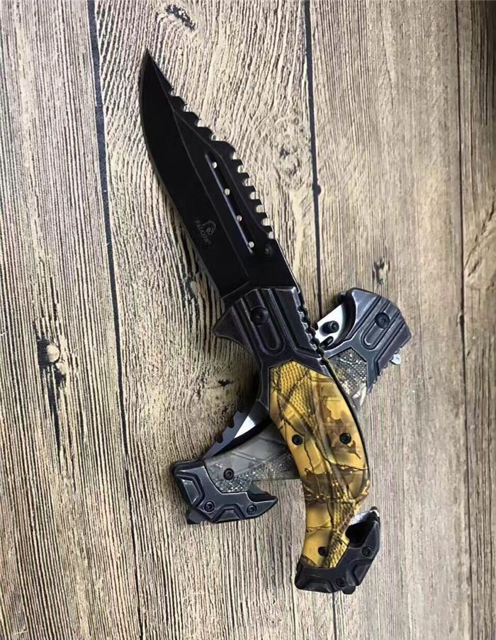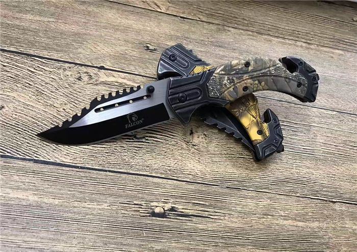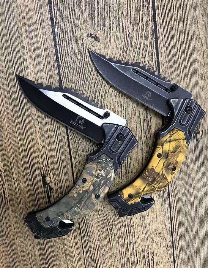 猎鹰系列双色快开折刀 全 长:21cm 刃 长:9cm 柄 长:12cm 刃 宽:3.0cm 刃 厚:0.3 刃 材:440 重 量:160克(含包装) 硬 度:58HRC 表 面:发黑+批丝 柄 材:迷彩 锁 型:快开 其 他:纸盒 锁 闭:线锁 备 注:带腰夹