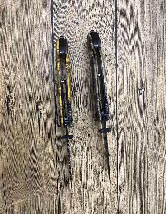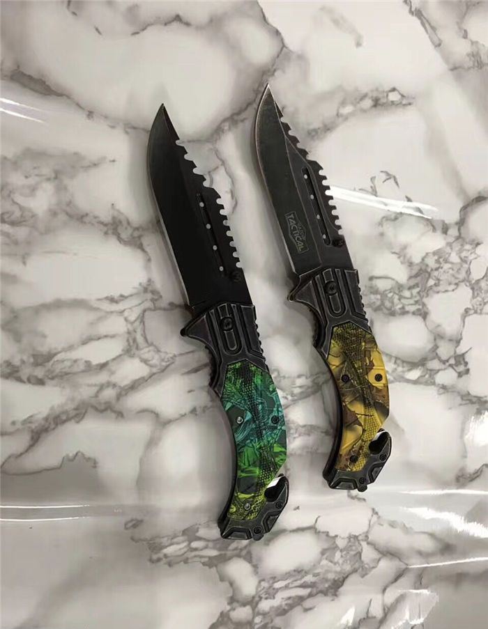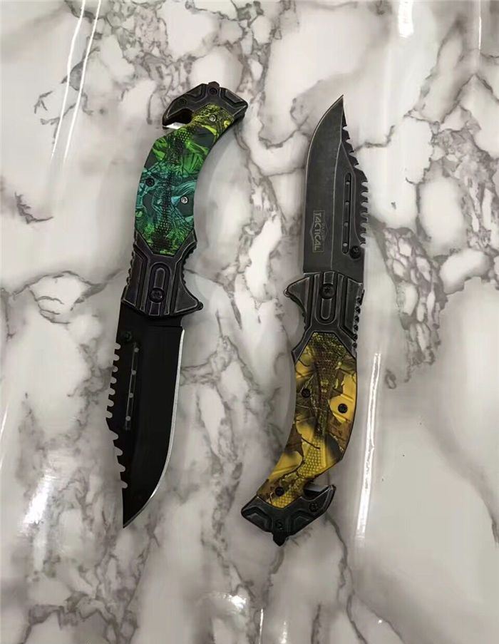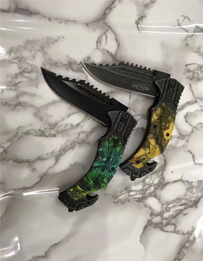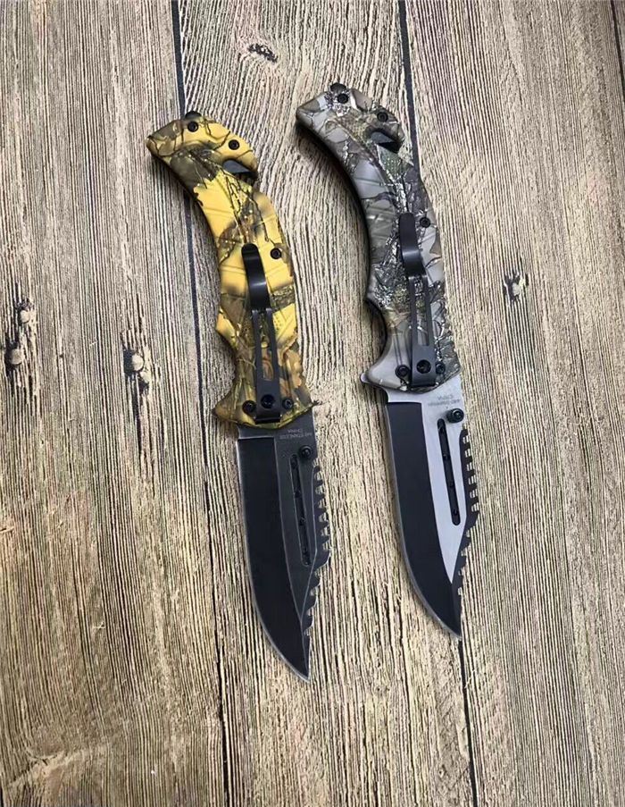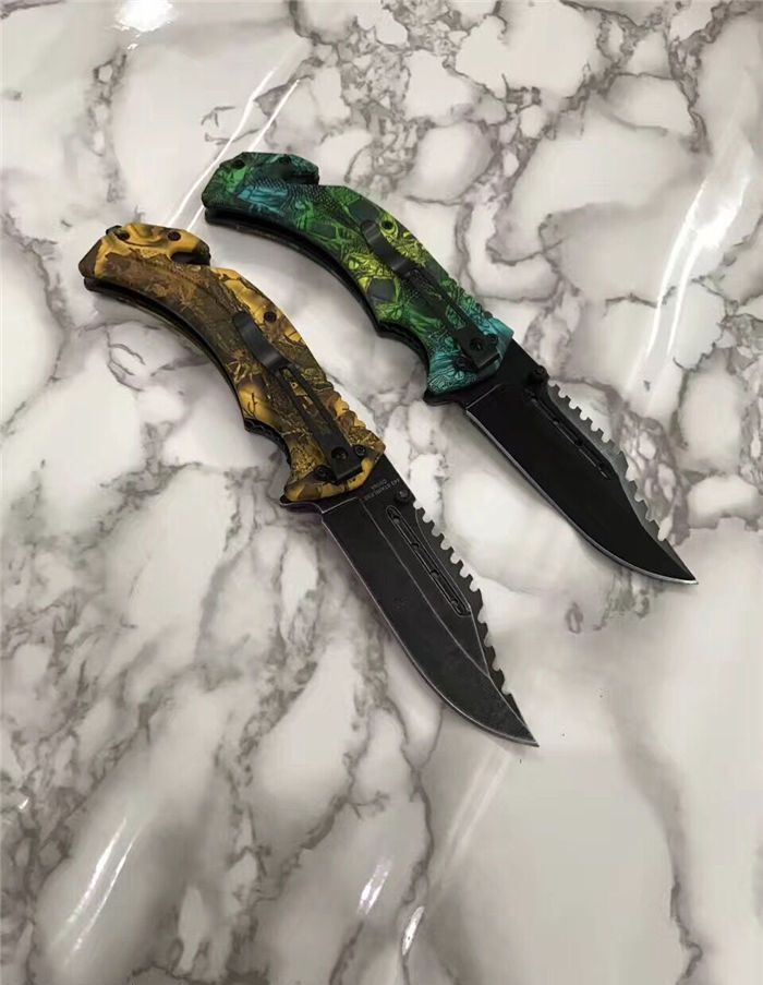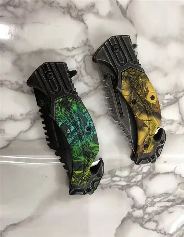 猎鹰系列双色快开折刀 全 长:21cm 刃 长:9cm 柄 长:12cm 刃 宽:3.0cm 刃 厚:0.3 刃 材:440 重 量:160克(含包装) 硬 度:58HRC 表 面:发黑+批丝 柄 材:迷彩 锁 型:快开 其 他:纸盒 锁 闭:线锁 备 注:带腰夹
