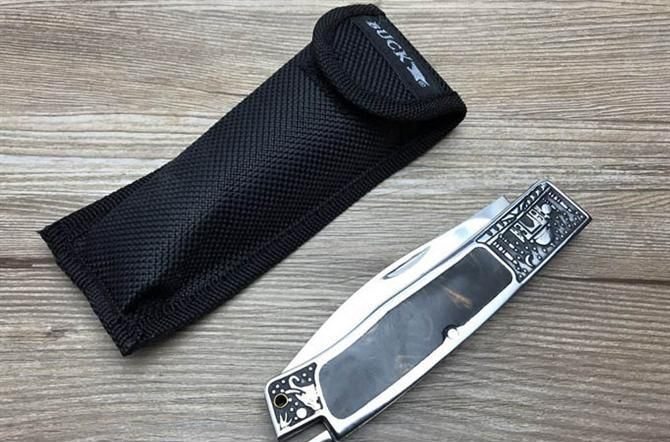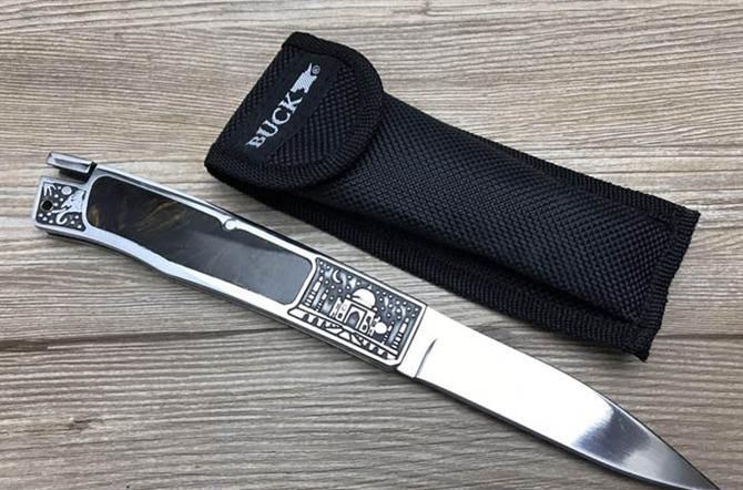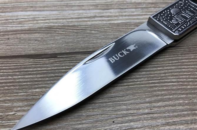 巴克夜幕折刀 全 长: 23cm 刃 长: 10cm 刃 宽: 2.2cm(最宽处) 刀 柄: 13cm 硬 度: 57HRC 刃 厚: 0.29cm 重 量: 250克 表 面: 镜光 刃 材: 440C 柄 材: 全钢头雕花+聚脂柄 锁 闭: 传统式制尾锁 其 他: 尼龙套包装,刃口锋利