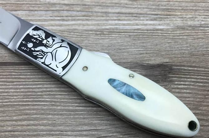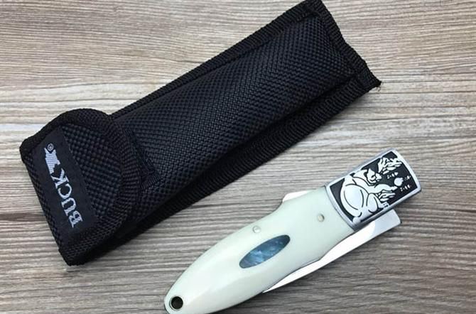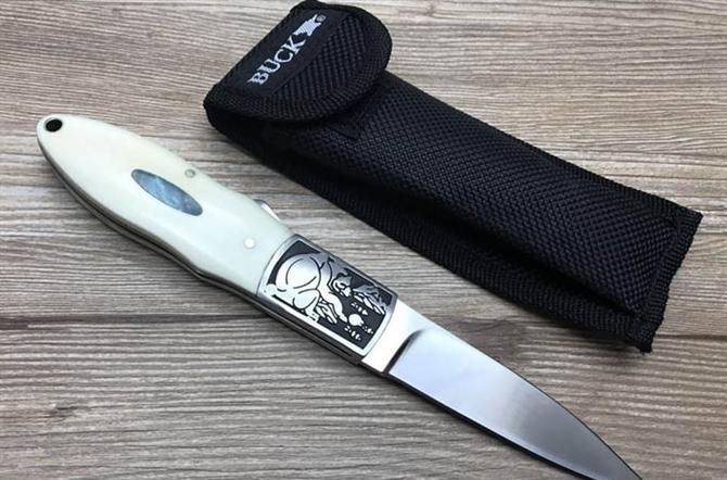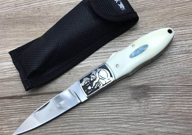 巴克小肥熊折刀 全 长: 20.5cm 刃 长: 8.6cm 刃 宽: 2.0cm(最宽处) 闭 合: 11.5cm 硬 度: 57HRC 刃 厚: 0.29cm 重 量: 150克 表 面: 镜光 刃 材: 440C 柄 材: 全钢头雕花+聚脂柄 锁 闭: 传统式制尾锁 其 他: 尼龙套包装,刃口锋利