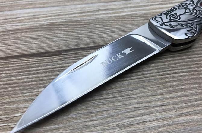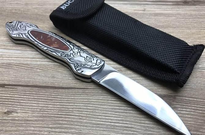 巴克海鲨折刀 全 长: 20.3cm 刃 长: 8.7cm 刃 宽: 1.9.cm(最宽处) 刀 柄: 11.6cm 硬 度: 57HRC 刃 厚: 0.28cm 重 量: 200克 表 面: 镜光 刃 材: 440C 柄 材: 全钢头雕花 锁 闭: 传统式制尾锁 其 他: 尼龙套包装,刃口锋利