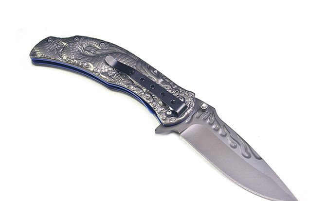 勃朗宁B063浮雕神龙灰钛快开折刀 全 长:21cm 刃 长:9.5cm 柄 长:12cm 刃 宽:2.8mm 刃 厚:2.5mm 刃 材:7Cr13 重 量:234g(含包装) 硬 度:58HRC 表 面:灰钛 柄 材:钢柄 图案浮雕 凸起 锁 型:快开 其 他:配彩盒