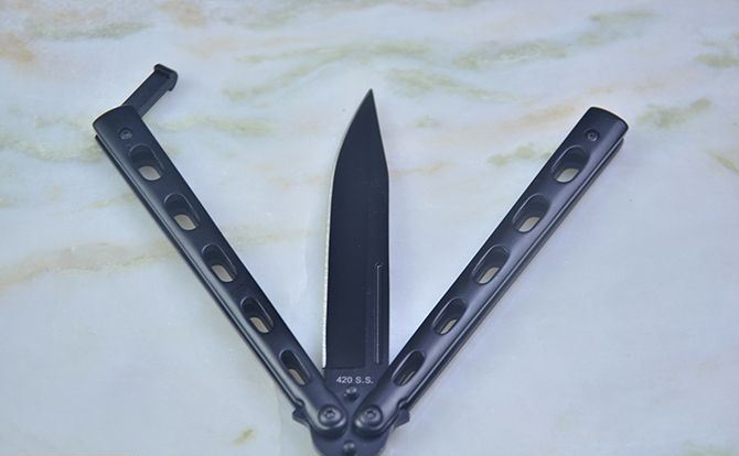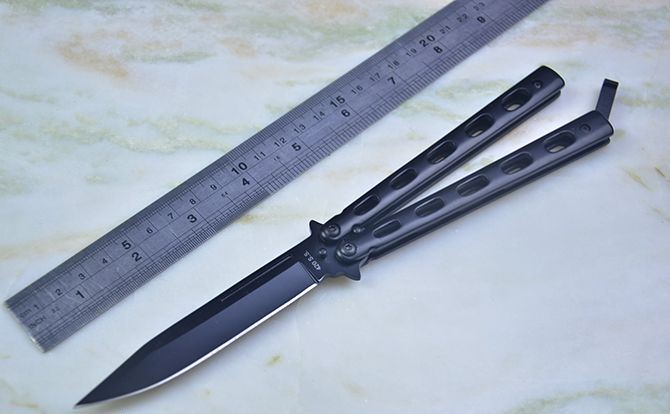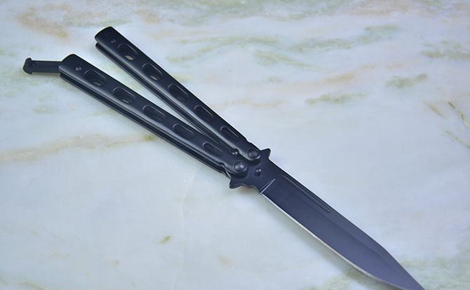 蝴蝶C33甩刀 全长: 22.5cm 刃长: 9.2cm 柄长: 12cm 刃宽: 1.5cm 刃材: 420SS 柄材: 全钢 硬度: 56HRC 重量: 140克 表面: 发黑