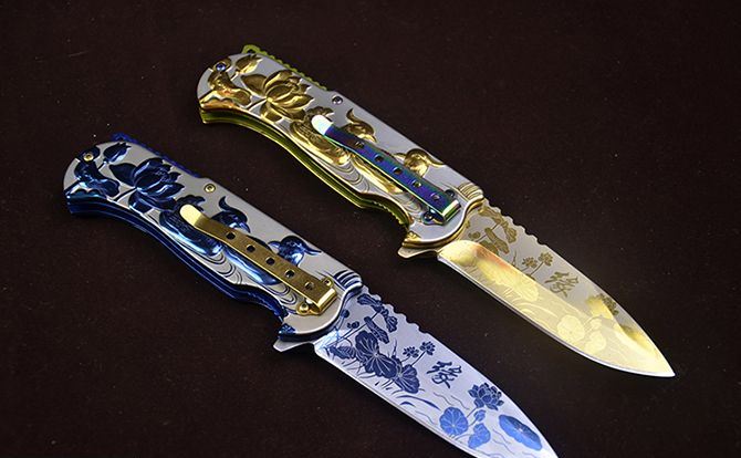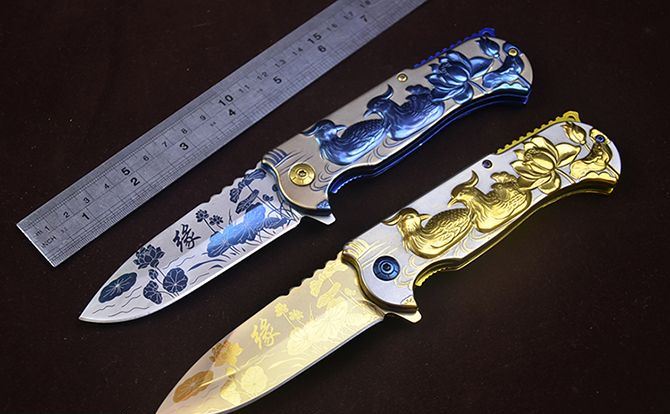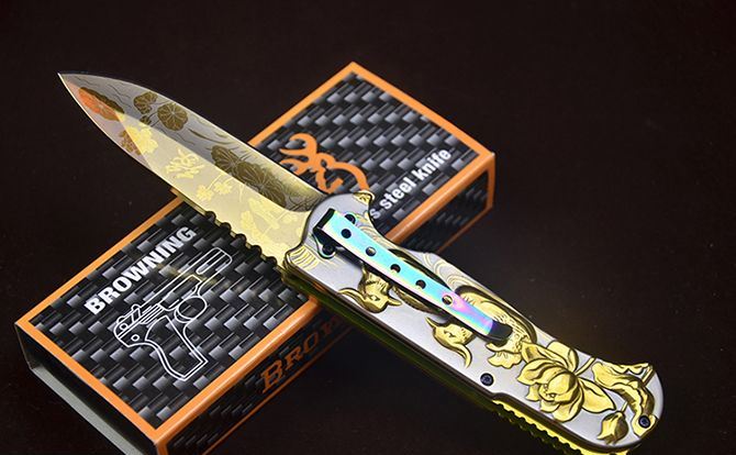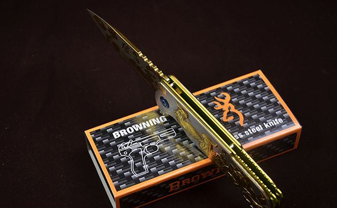勃朗宁B031浮雕鸳鸯快开折刀 全 长:210mm 刃 长:90mm 柄 长:120mm 刃 宽:2.5mm 刃 厚:2.9mm 刃 材:7Cr13 重 量:240g(含包装) 硬 度:58HRC 表 面:镜面彩钛和金色 柄 材:钢柄 图案浮雕 凸起 锁 型:快开 其 他:配彩盒