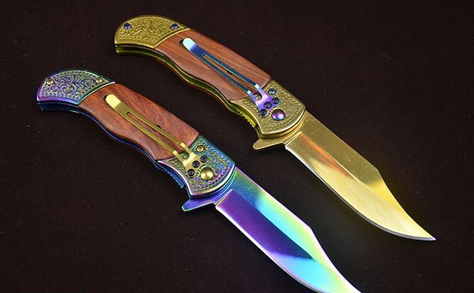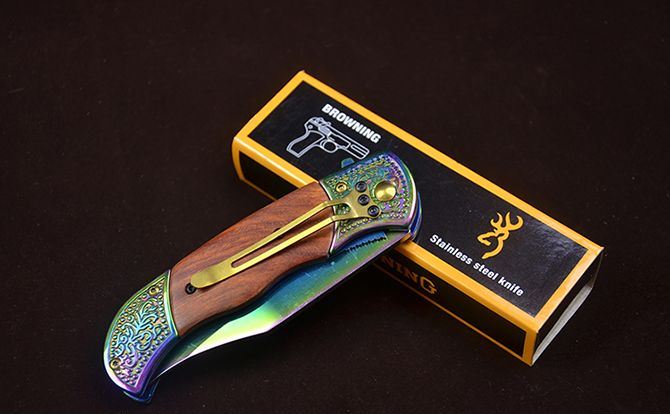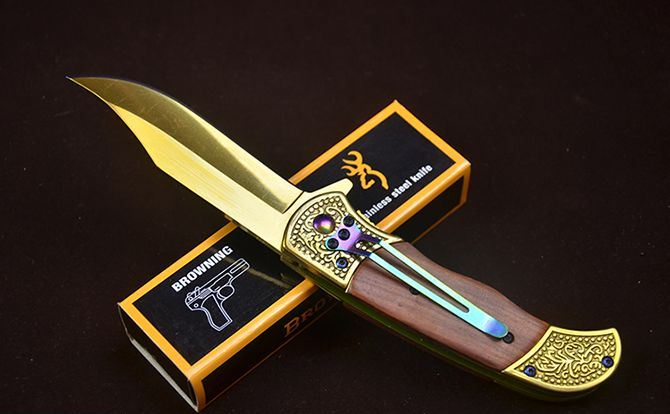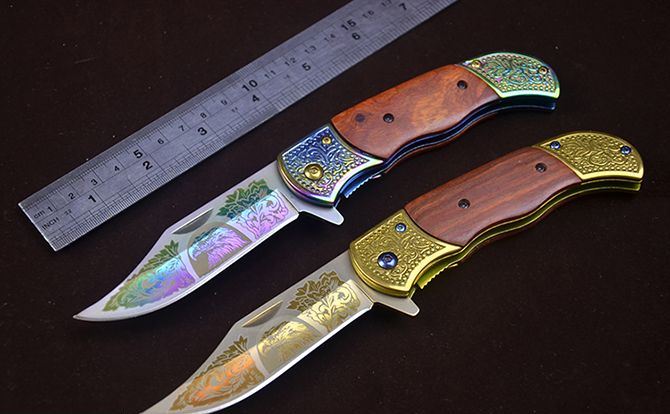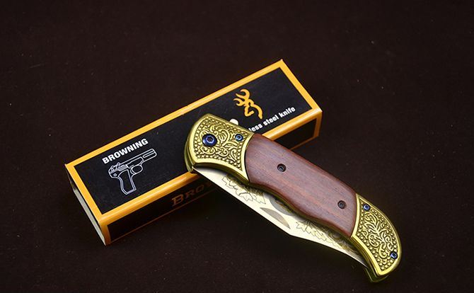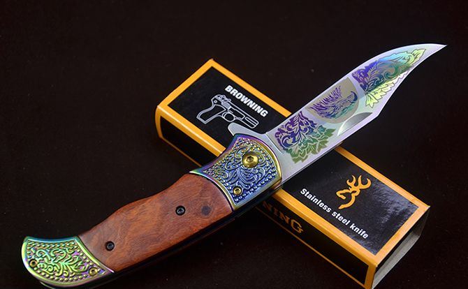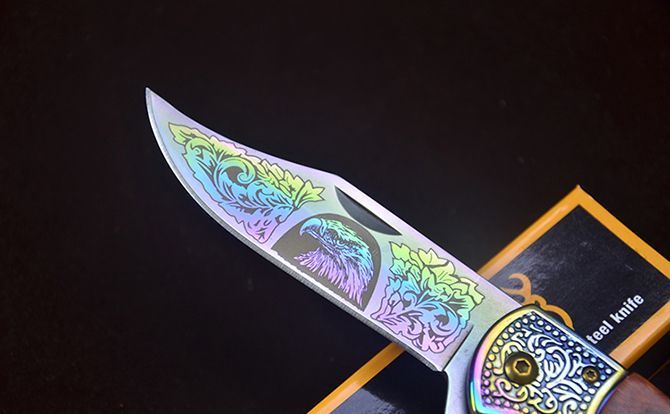 勃朗宁C047鹰图案快开折刀 全 长:20.2cm 刃 长:8.5cm 柄 长:12.3cm 刃 宽:2.5mm 刃 厚:2.8mm 刃 材:7Cr13 重 量:165g(含包装) 硬 度:58HRC 表 面:鹰图案+(镜面彩钛/金色)二色任选 柄 材:双钢头( 扎花)+红酸枝 锁 型:快开 其 他:配彩盒