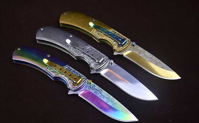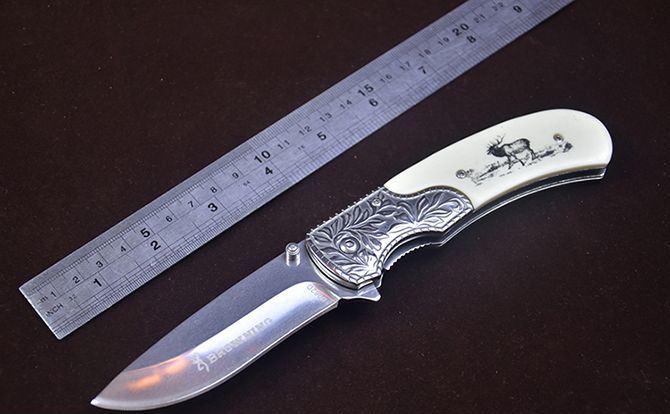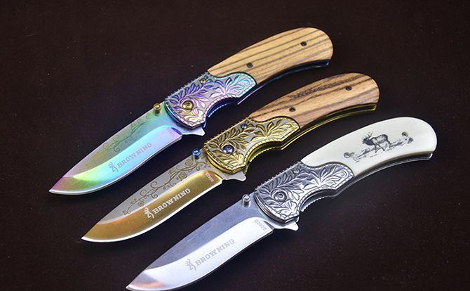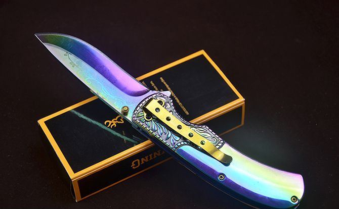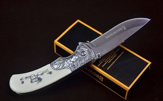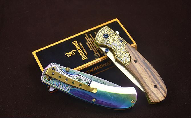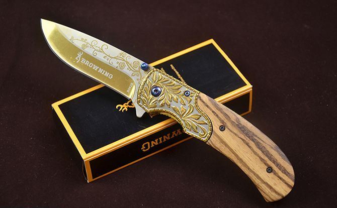 勃朗宁B062浮雕影木快开折刀 全 长:20.8cm 刃 长:8.8cm 柄 长:11.9cm 刃 宽:2.7cm 刃 厚:2.2mm 刃 材:5Cr13 重 量:200g(含包装) 硬 度:58HRC 表 面:雕刻纹彩钛和金色 柄 材:浮雕钢柄图案凸起+影木/牛骨 锁 型:快开 其 他:配彩盒