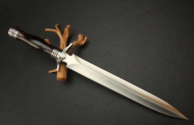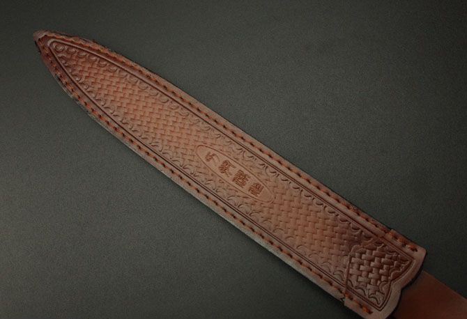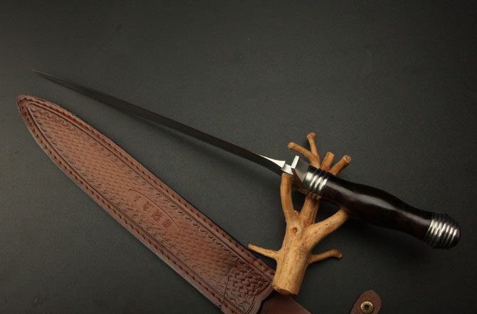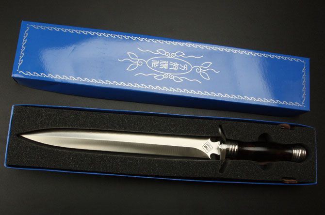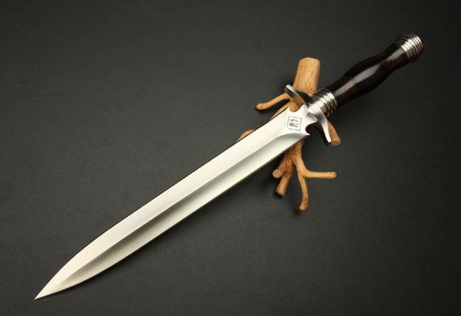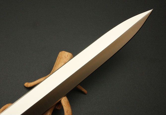 刃长:29cm 柄长:13.5cm 刃厚:6.9mm 刃宽: 3.3cm 刃材: 5Cr13 柄材: 黑檀木 硬度: 57HRC 重量:690克 表面处理: 手工砂光