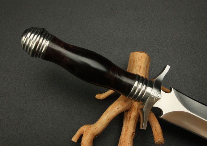 刀奴战魂(加长版) 全长:45cm 刃长:29cm 柄长:13.5cm 刃厚:6.9mm 刃宽: 3.3cm 刃材: 5Cr13 柄材: 黑檀木 硬度: 57HRC 重量:690克 表面处理: 手工砂光