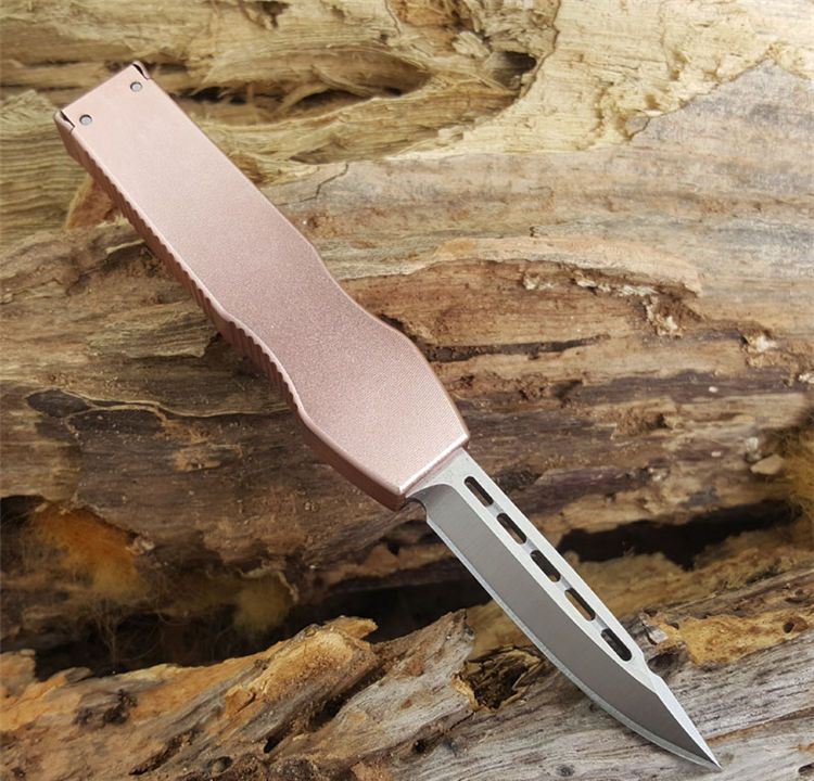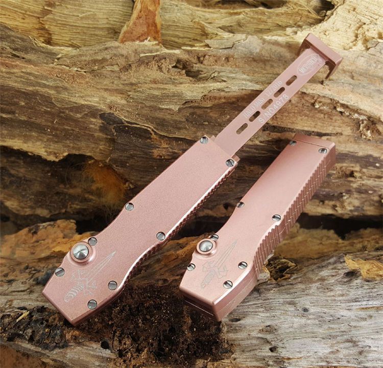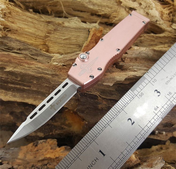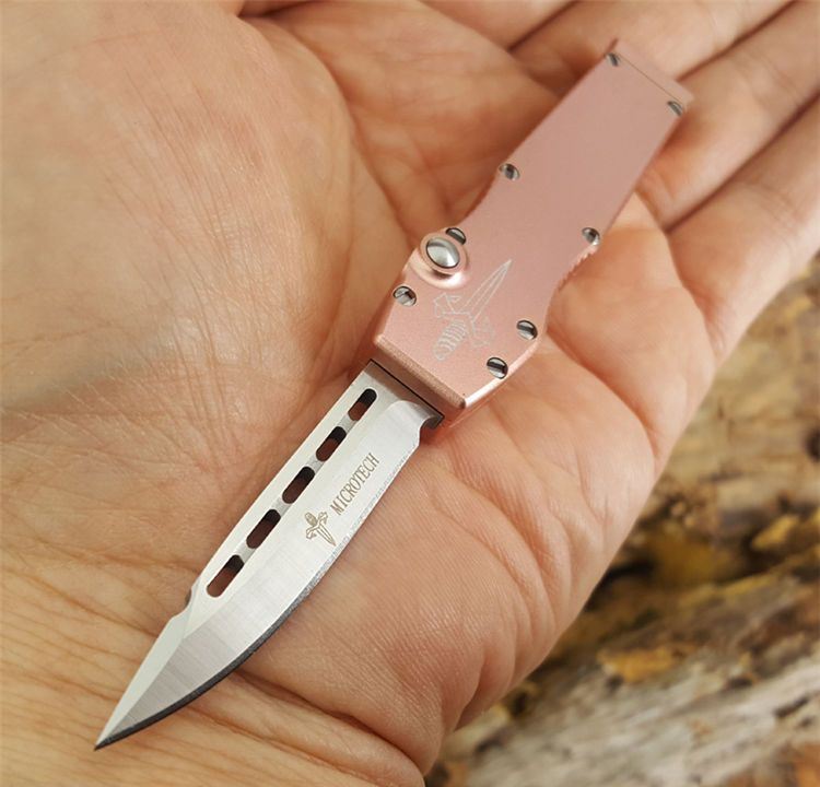 Microtech 微技术Halo mini迷你Spear矛尖刃,T6061航空铝握柄,玫瑰金特别版本,D2刃材,独特拉杆收納装置,全数控精确加工,不摇头,锁定精确,小巧迷你,可玩性超强,独具收藏价值