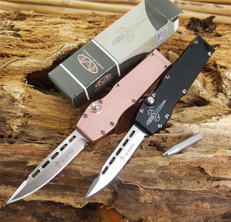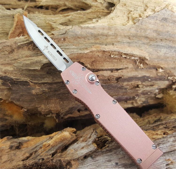 微技术halo mini光环经典款式玫瑰金直跳刀 刃材:D2 全长:12cm 刃长:5 刃厚:0.3cm 刃宽:1cm 闭合长度:7cm 柄材:T6型航空铝 附件:纸盒+维护工具 重量:30克 Microtech 微技术Halo mini迷你Spear矛尖刃,T6061航空铝握柄,玫瑰金特别版本,D2刃材,独特拉杆收納装置,全数控精确加工,不摇头,锁定精确,小巧迷你,可玩性超强,独具收藏价值