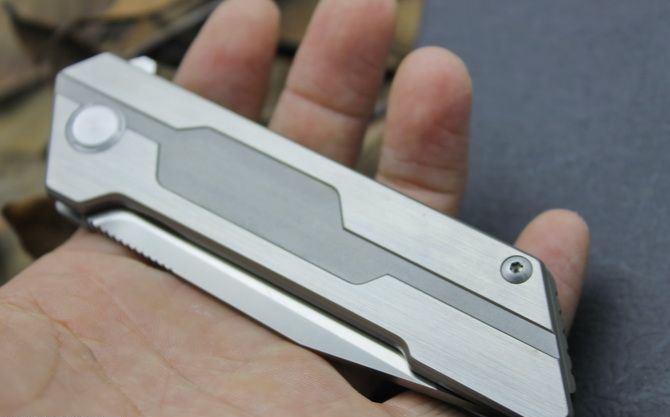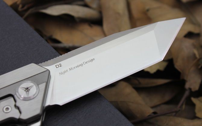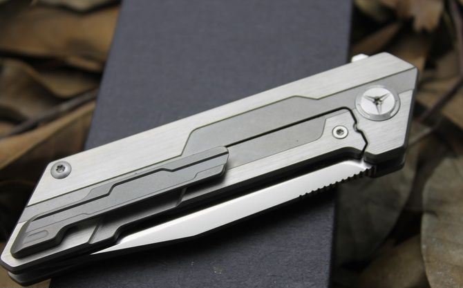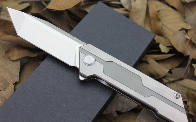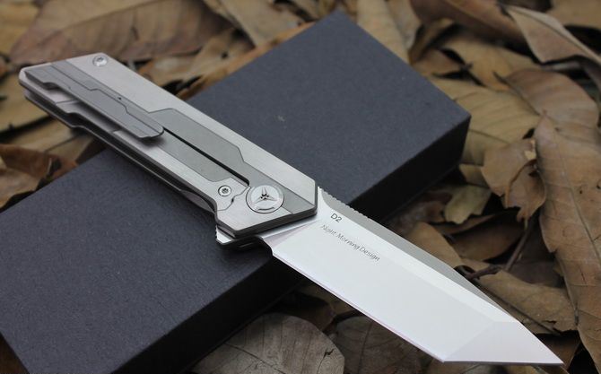 追踪者D2钢折刀 全 长:19.6cm 刃 长:8.8cm 柄 长:12.4cm 刃 宽:2.7cm 刃 厚:3.8mm 刃 材:D2钢(精细沙光处理) 刀 重: 127g 总 量:201g (含包装物) 硬 度:58-59HRC 表 面:手工磨沙 柄 材:正反面CT-4 喷沙拉丝.钛柄。 刀 夹:超弹力钛夹 锁 型:线锁。 螺 丝:所有螺丝420不锈钢硬度HRC45,全CNC精雕加工,内置轴承。 结 构:线锁
