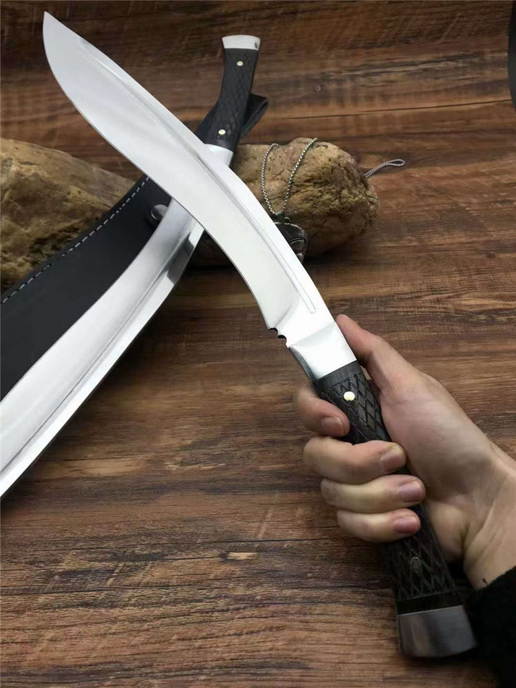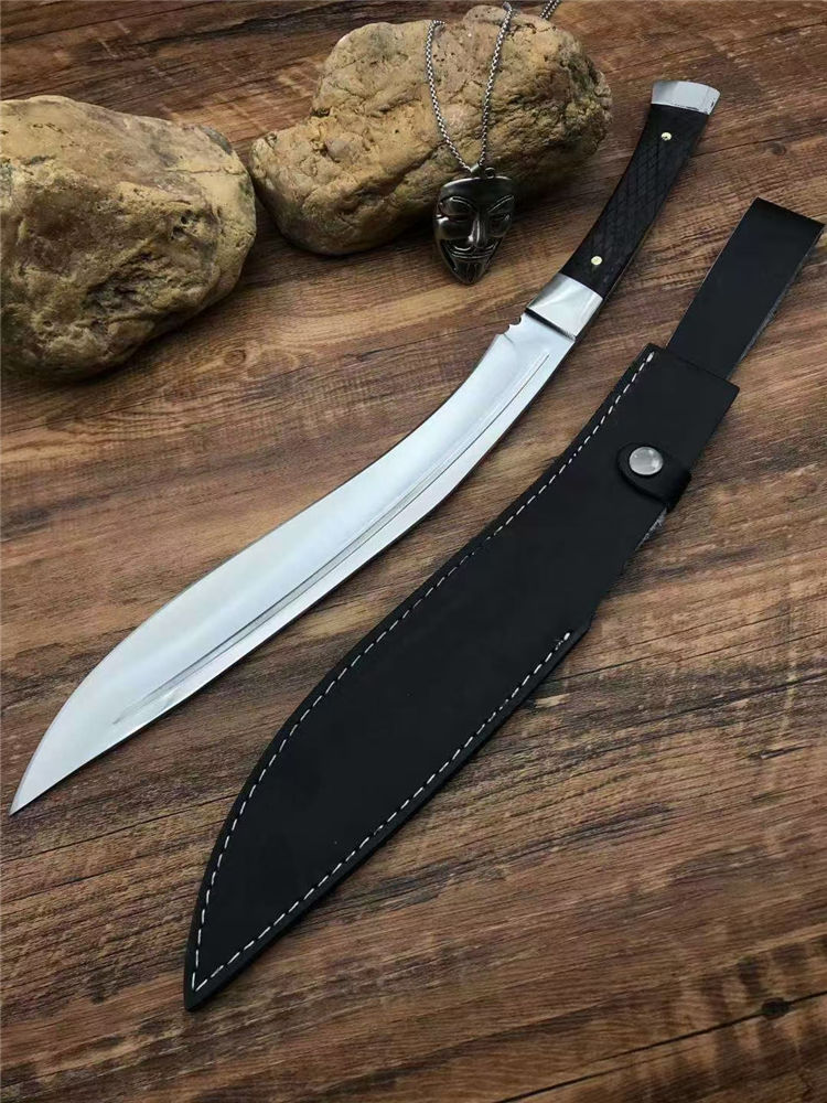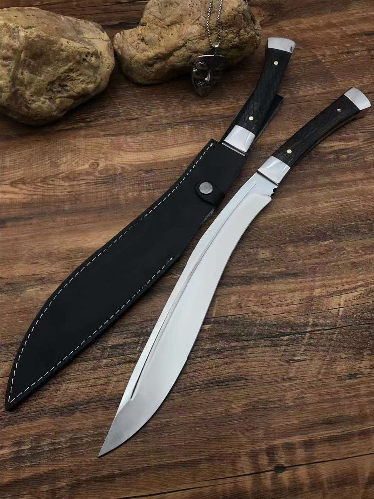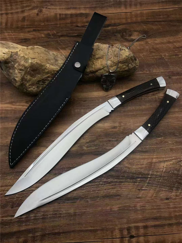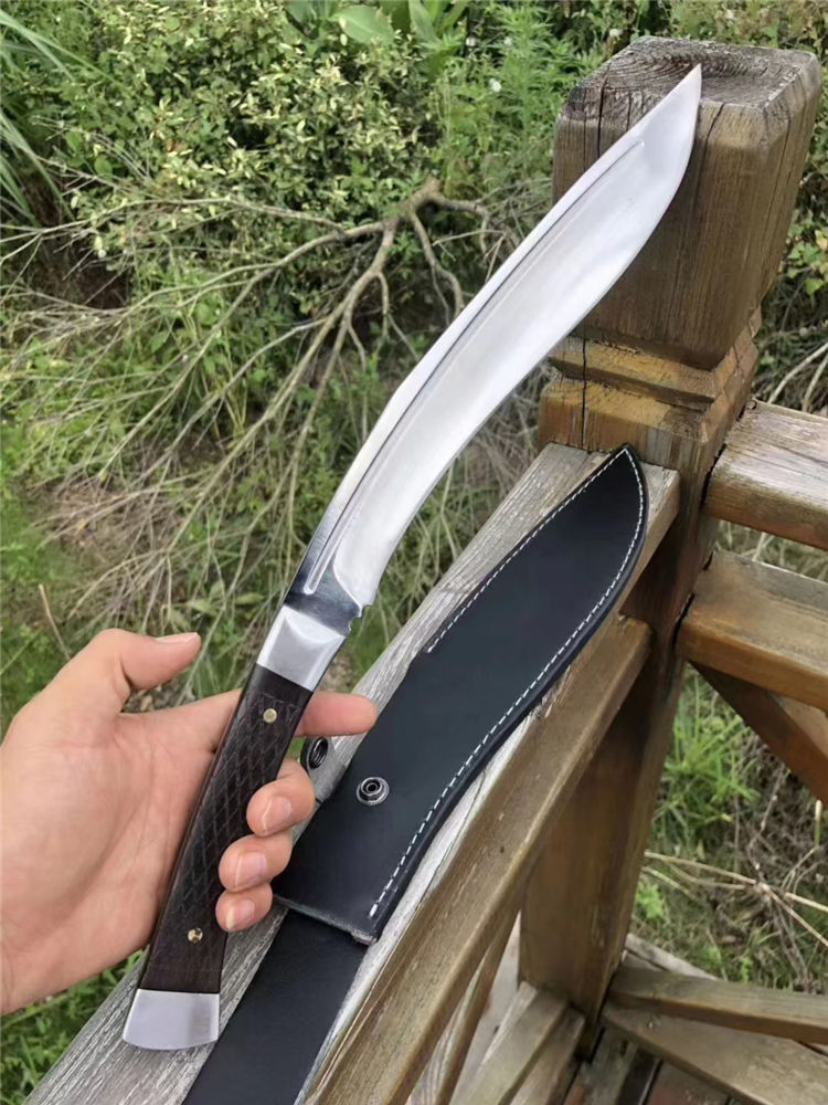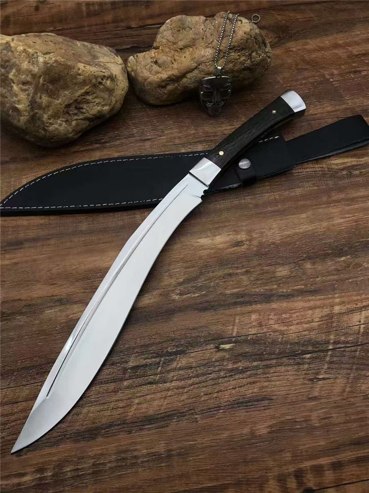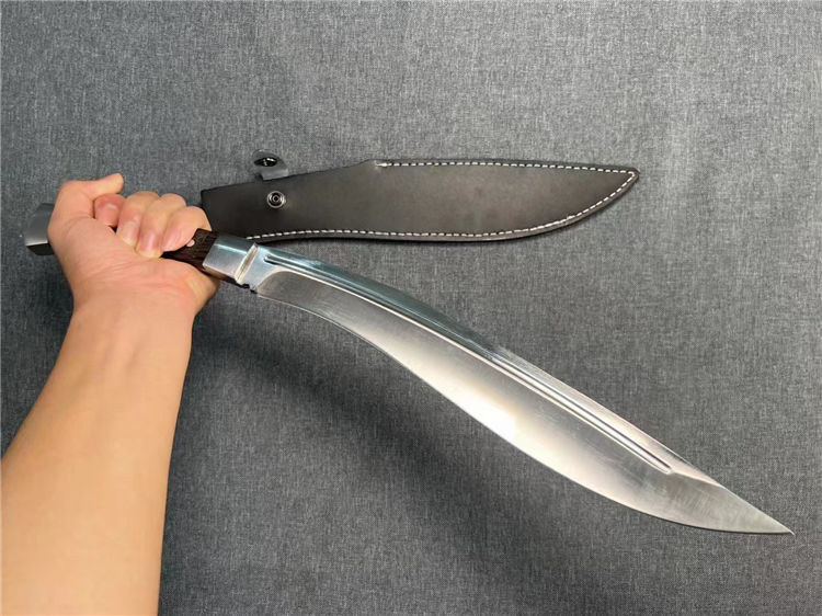 加长版一体尼泊尔镜光狗腿刀 全长:47.3cm 刃长:29.5cm 柄长:17.8cm 厚度:5.8mm 硬度:58 钢材:进口高碳钢 柄材:黑檀木 表面:超镜光(一体龙骨) 单刀重量:900g
