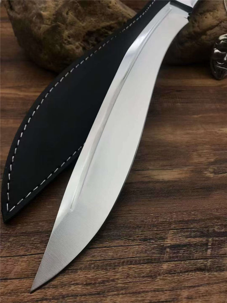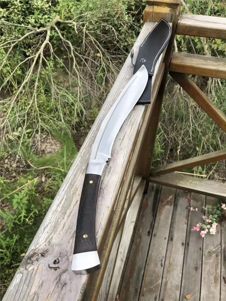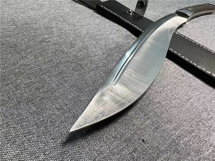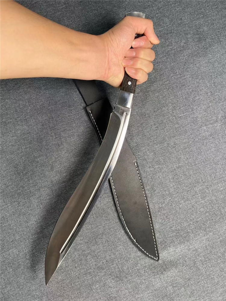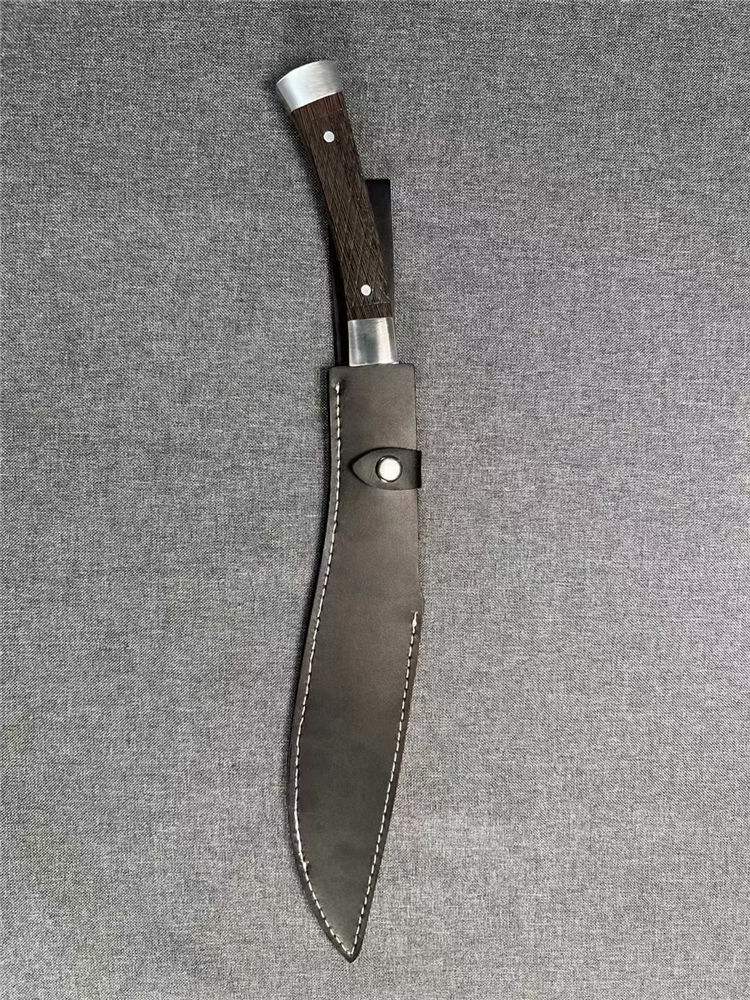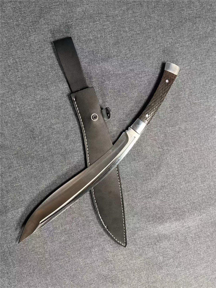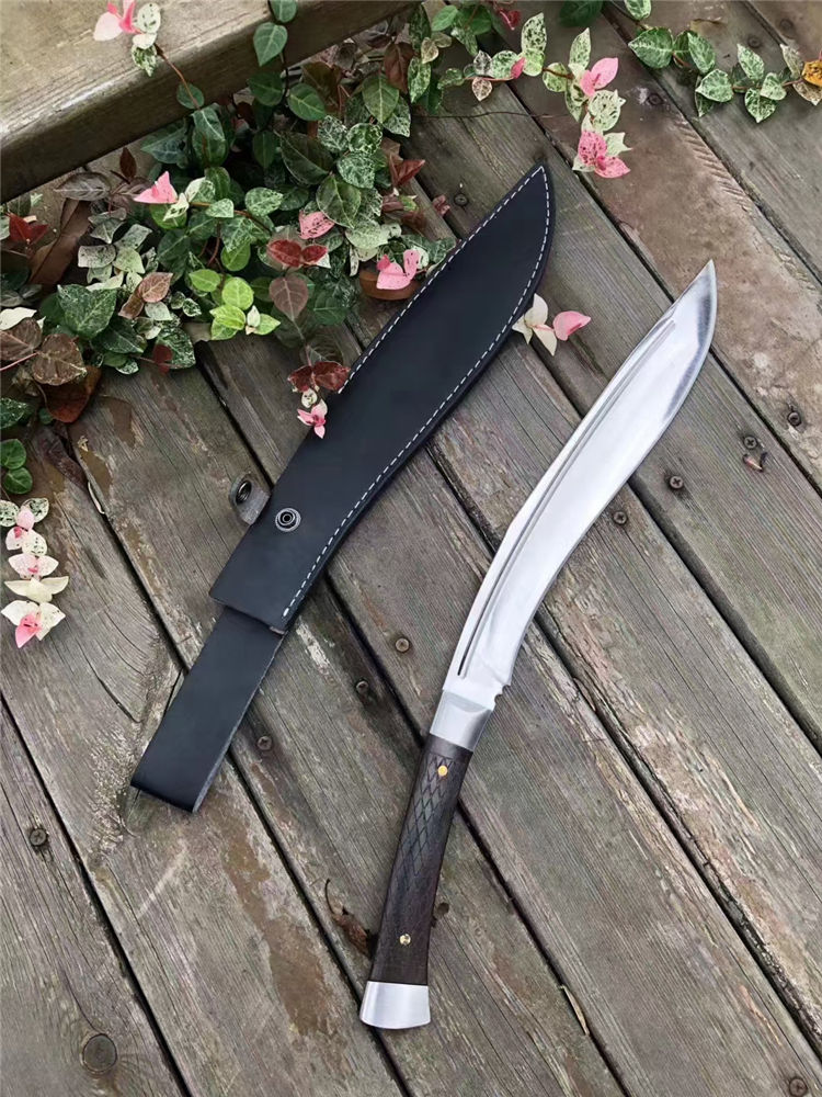加长版一体尼泊尔镜光狗腿刀 全长:47.3cm 刃长:29.5cm 柄长:17.8cm 厚度:5.8mm 硬度:58 钢材:进口高碳钢 柄材:黑檀木 表面:超镜光(一体龙骨) 单刀重量:900g