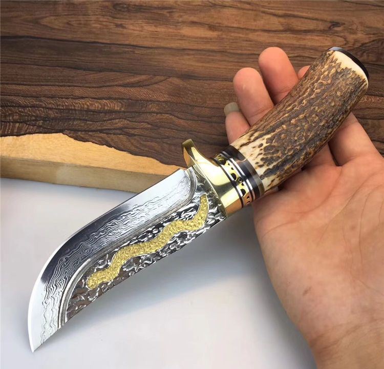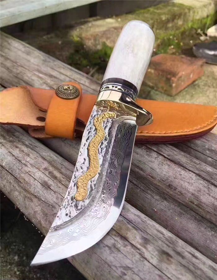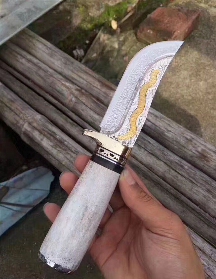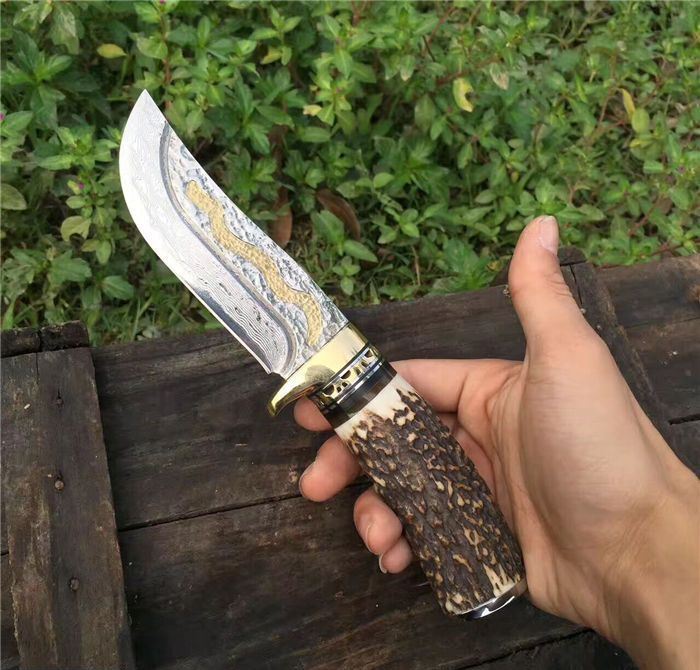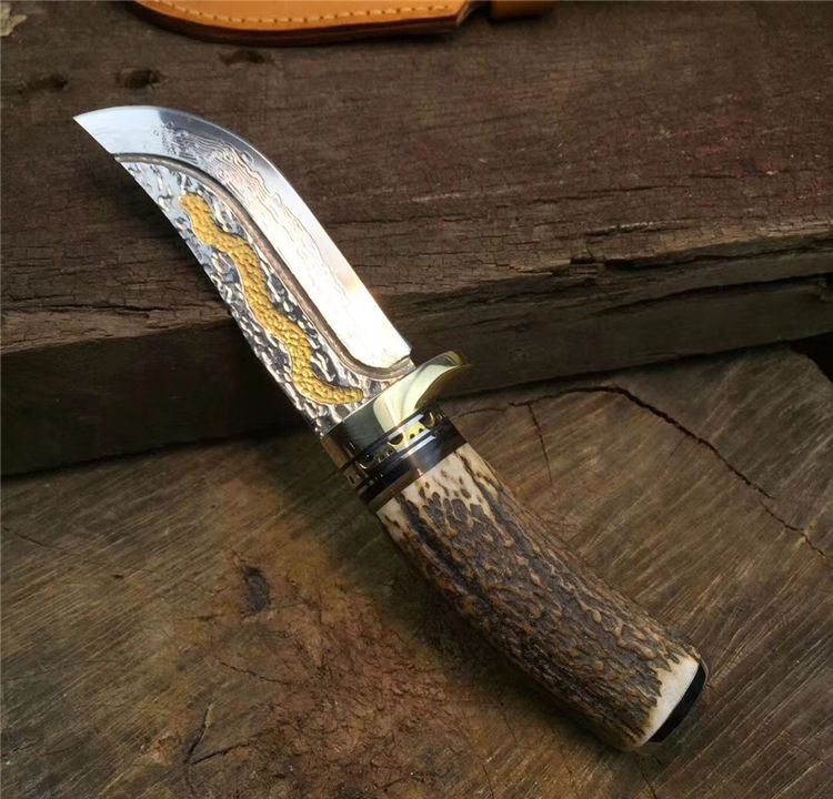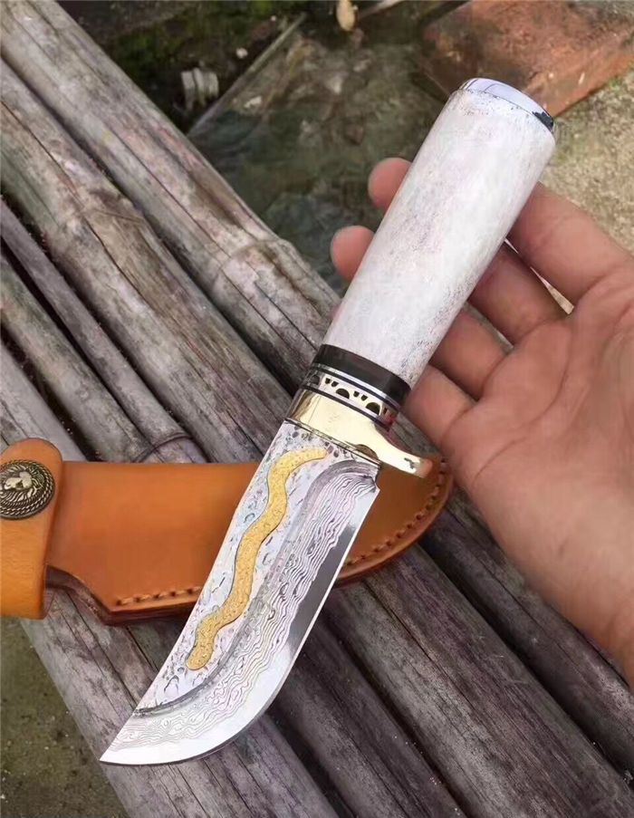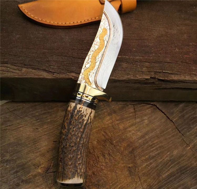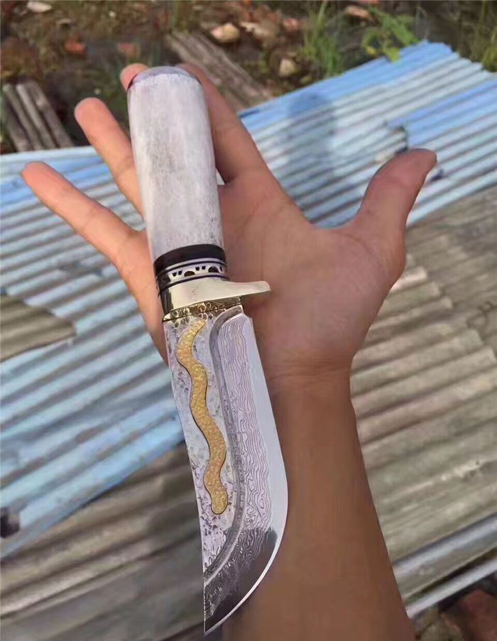 金龙世家大马士革直刀 全长:22cm 刃长:10.5cm 柄长:11cm 刀刃厚度:4.2mm 硬度:60HRC 刃钢材:VG10大马士革钢(75层) 配套:手工牛皮套(雄狮扣钉) 手柄材料做工:纯黄铜护手+黑牛角隔片+天然粗鹿角+手柄尾部镶(天然七彩鲍鱼贝壳)