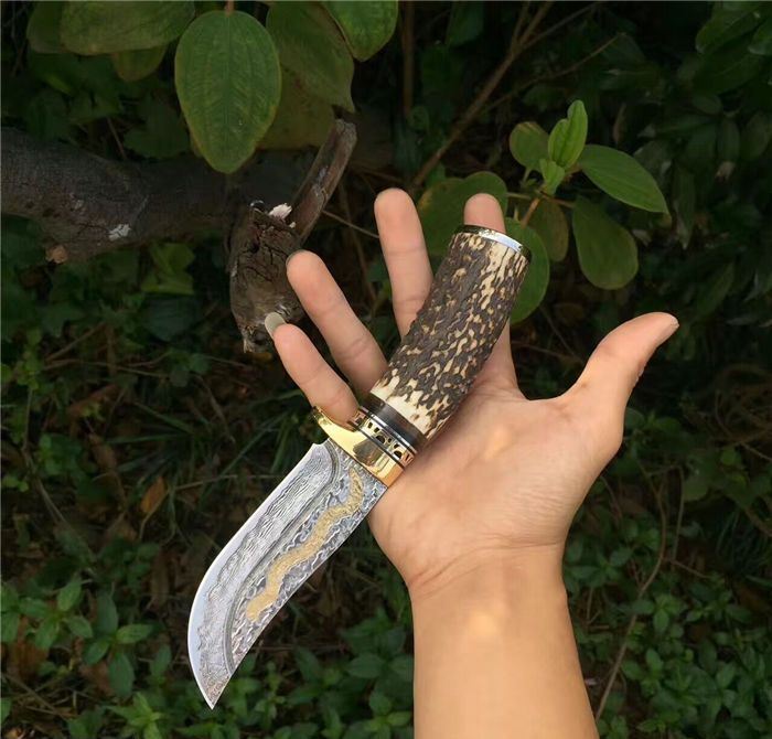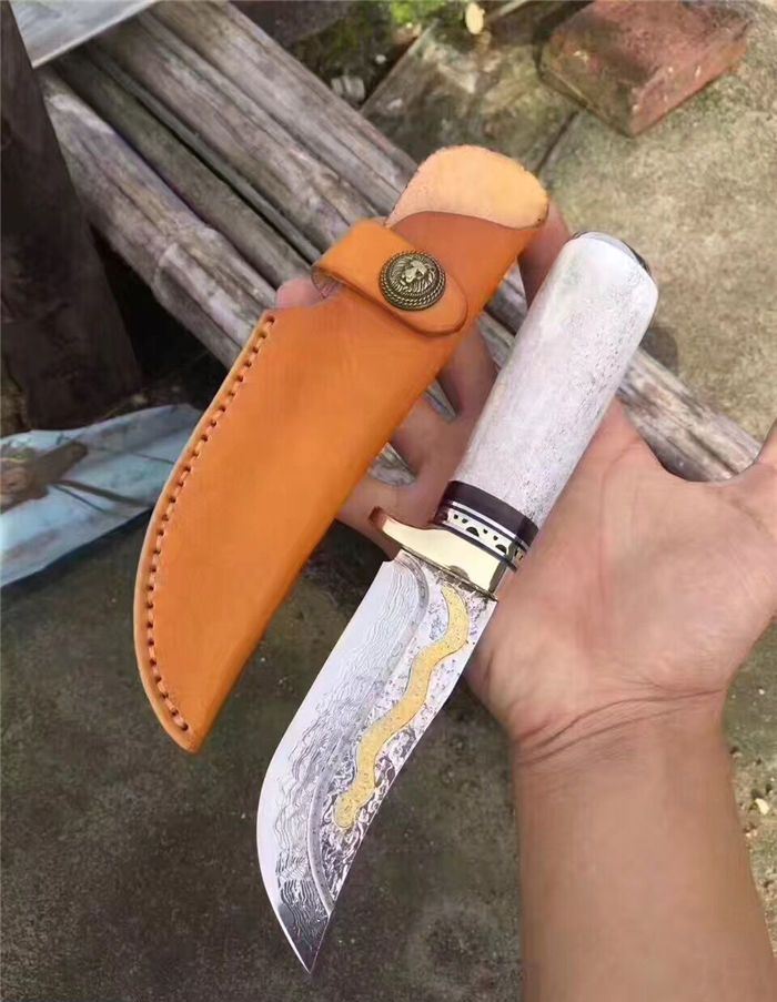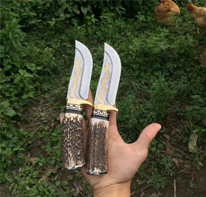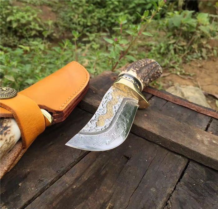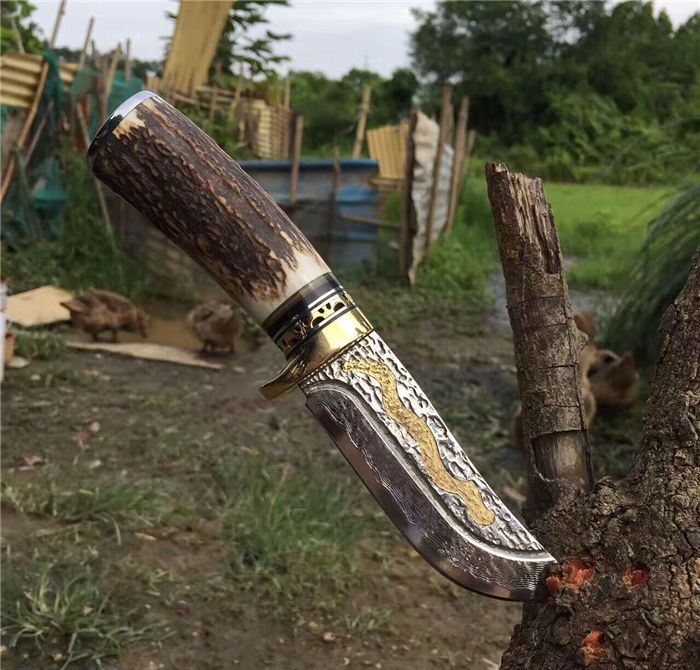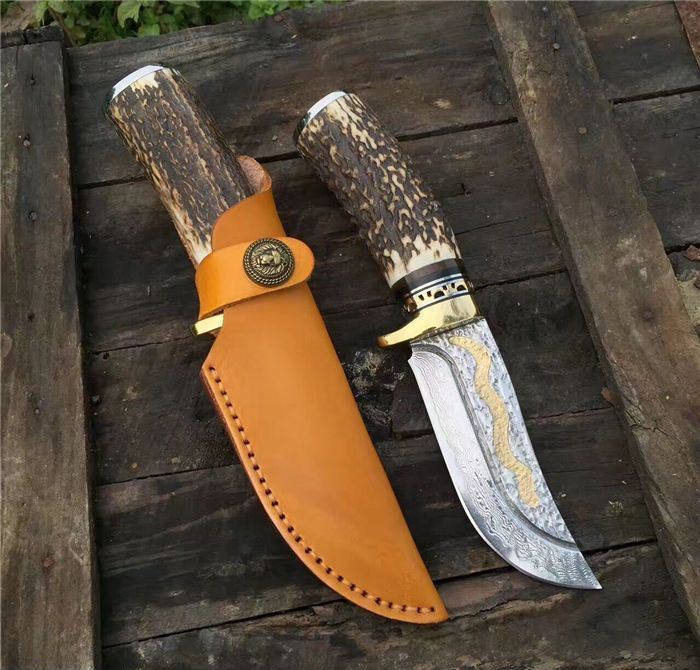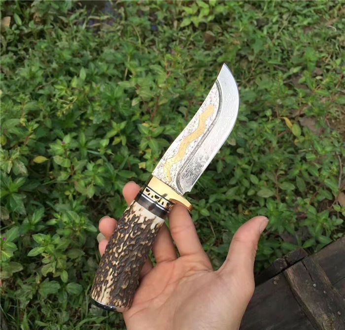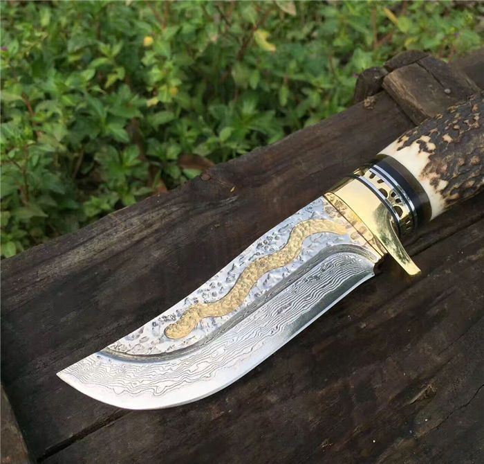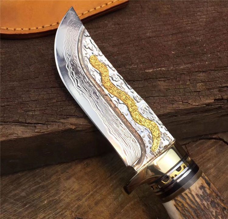 金龙世家大马士革直刀 全长:22cm 刃长:10.5cm 柄长:11cm 刀刃厚度:4.2mm 硬度:60HRC 刃钢材:VG10大马士革钢(75层) 配套:手工牛皮套(雄狮扣钉) 手柄材料做工:纯黄铜护手+黑牛角隔片+天然粗鹿角+手柄尾部镶(天然七彩鲍鱼贝壳)