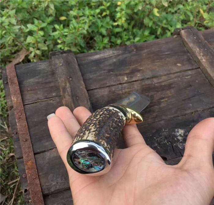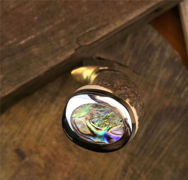 手柄材料做工:纯黄铜护手+黑牛角隔片+天然粗鹿角+手柄尾部镶(天然七彩鲍鱼贝壳)