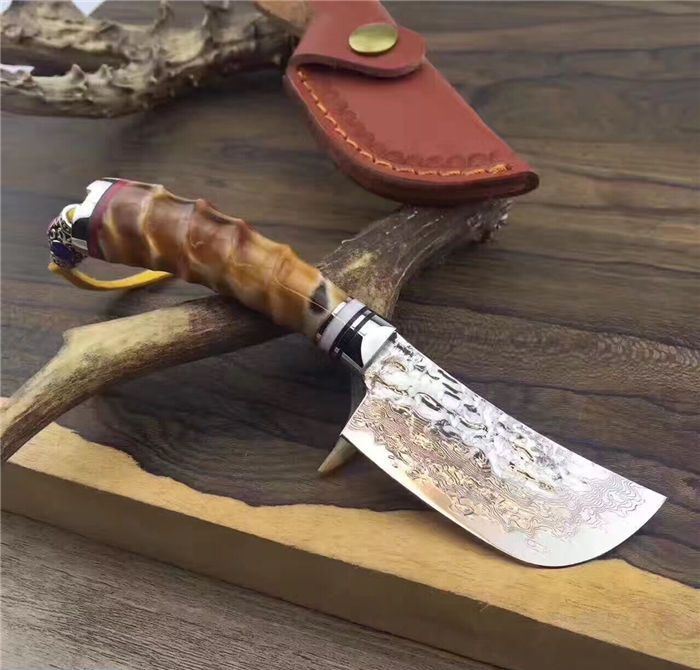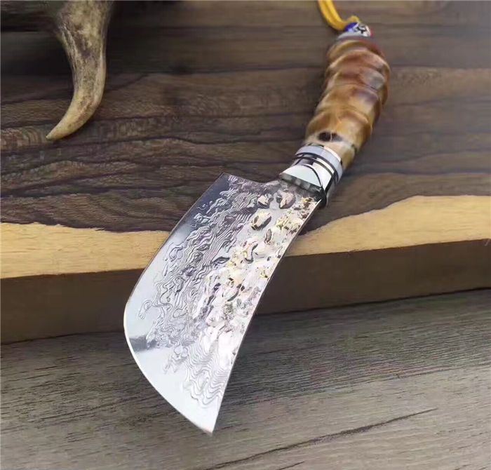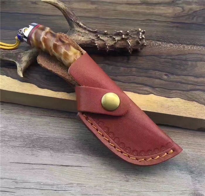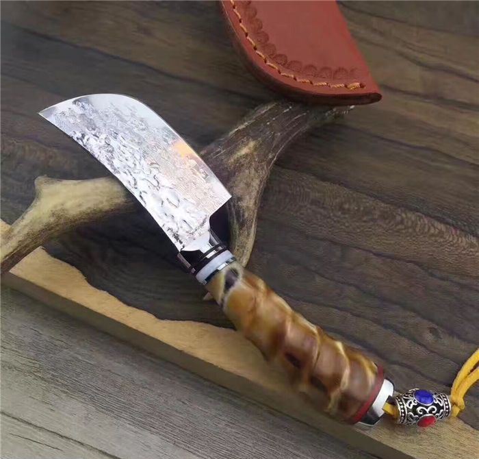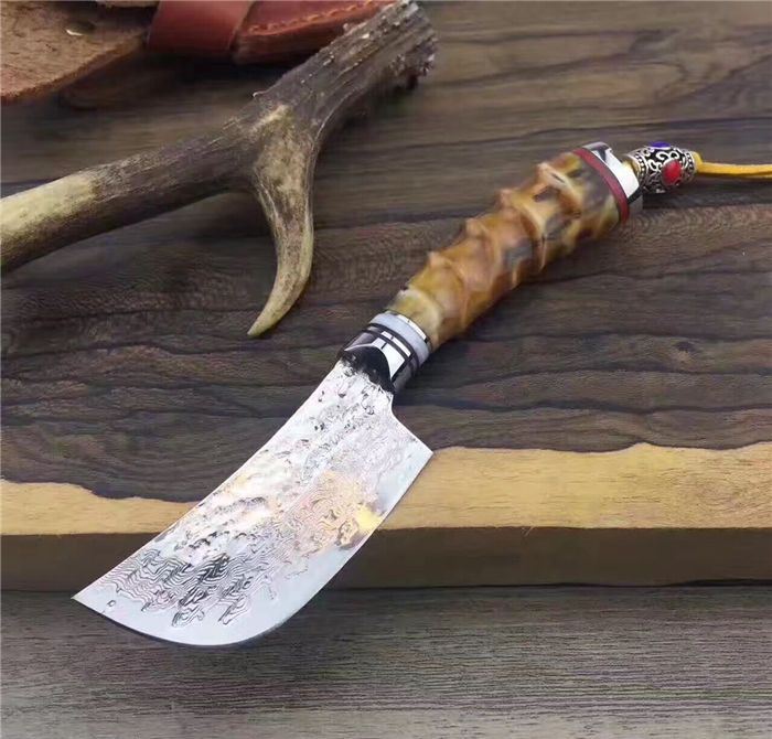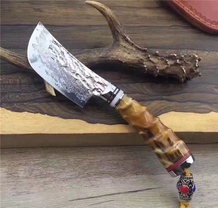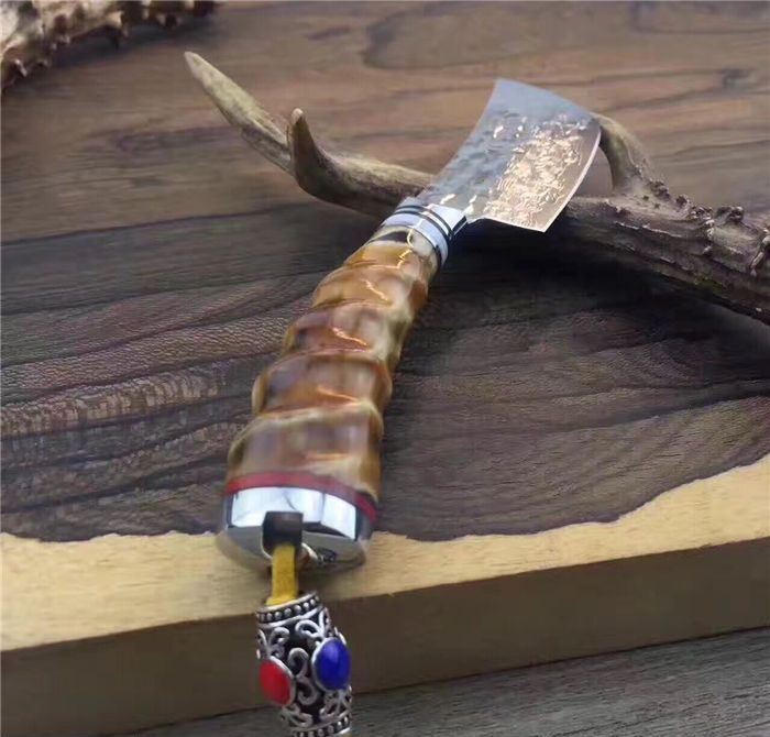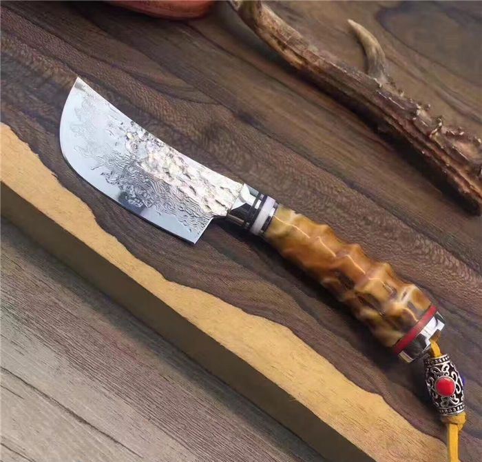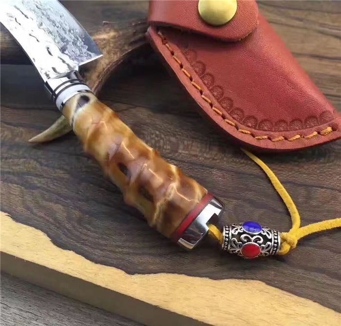 余月黄羊角小菜刀 全长:15cm 刃长:7cm 手柄长:8cm 厚度:3mm 硬度:59HRC 刃材:大马士革钢VG10 手柄用料:白钢头+牛角隔片+天然精选黄羊角料、尾部可穿各种吊坠 配套包装/高端牛皮刀套、硬黑印花礼品盒