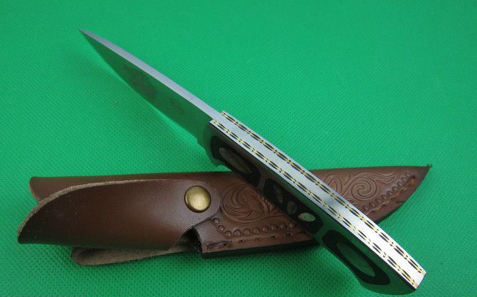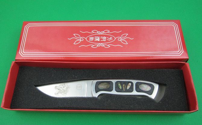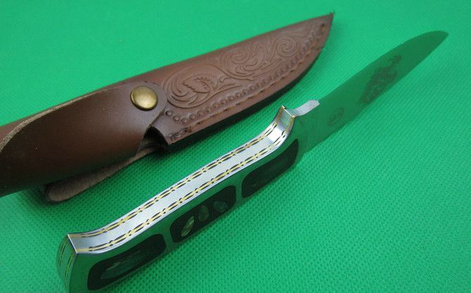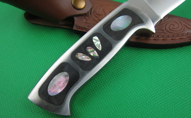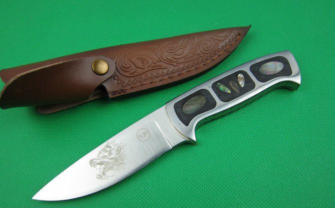 刀奴狼魂 全 长:220mm 刃 长:97mm 柄 长:112mm 刃 宽:32mm 刃 厚:4.8mm 刃 材:5Cr13 重 量:340g(含皮套) 硬 度:57HRC 表 面:砂光 柄 材:钢+彩贝+铜片 锁 型:定锁 其 他:配彩盒和皮套