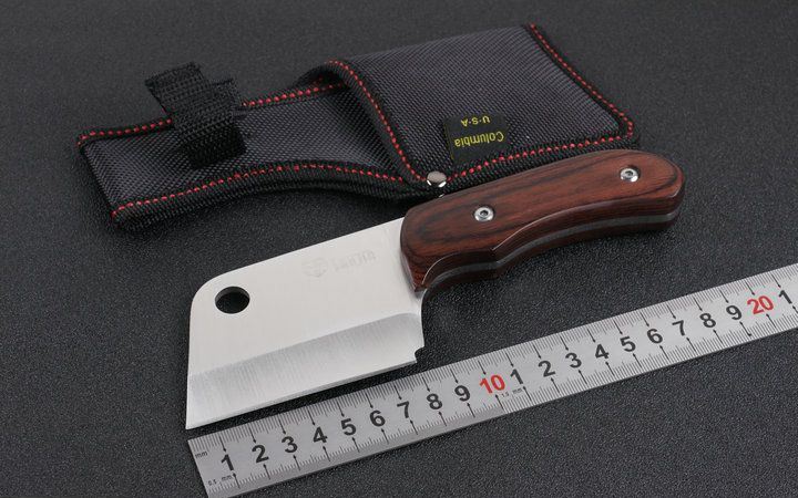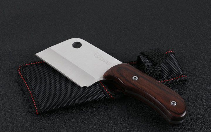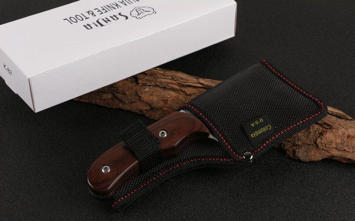 K87野外刀木柄 全长:19.5cm 刃长:8.5cm 刃厚:0.35mm 刃宽:5.9cm 柄长:10.5cm 刃材:440 刀重:235克 总重:300克 表面:精细沙光 柄材:高密度防滑纹彩木 硬度:58 刀鞘:尼龙套 包装:原厂礼品盒