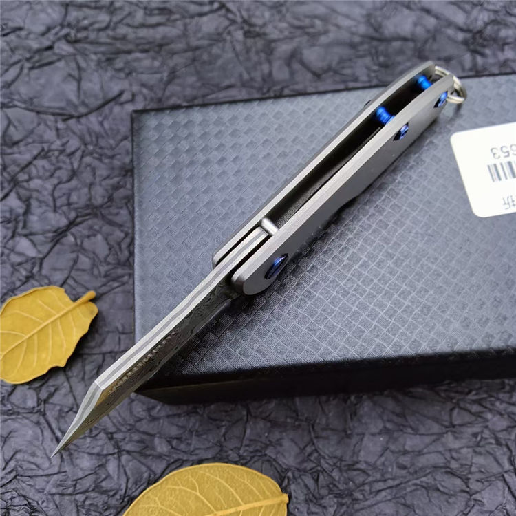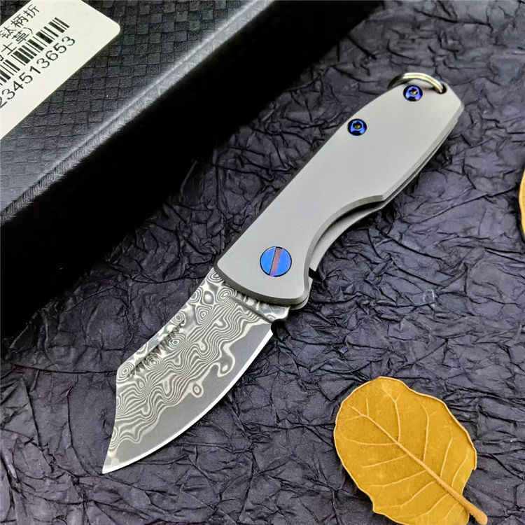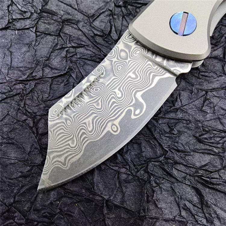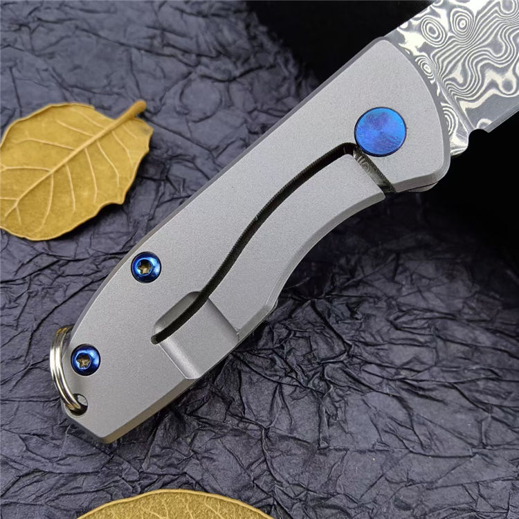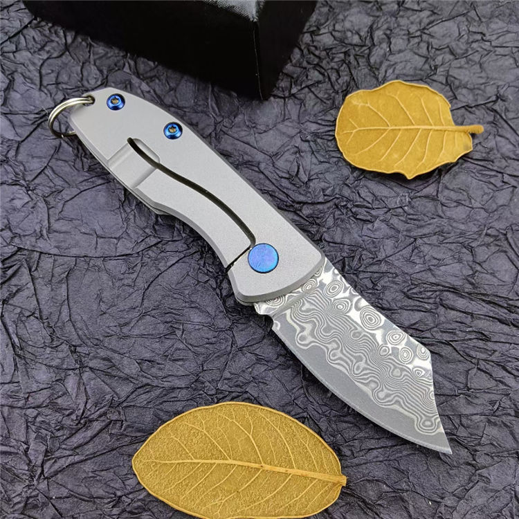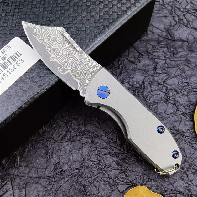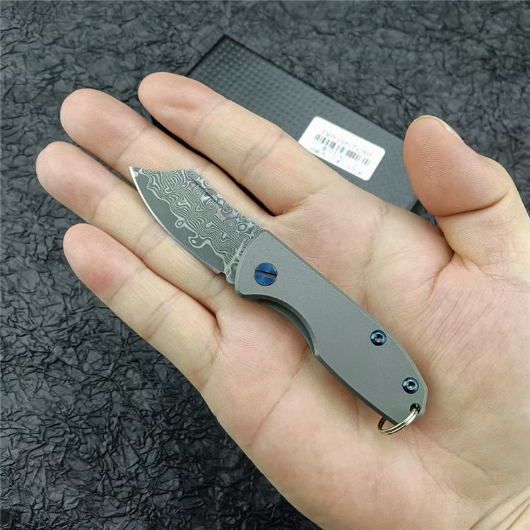 钛柄小剃刀大马士革款 总 长:105mm 刃 长:45mm 柄 长:60mm 刃 厚:2.9mm 刃 材:VG0钢100% 刃 面处理:大马士革原有花纹 柄 材:钛合金 硬 度:58-59° 锁 定:线锁 重 量:65克(含包装) 包 装:原厂礼品盒+布袋