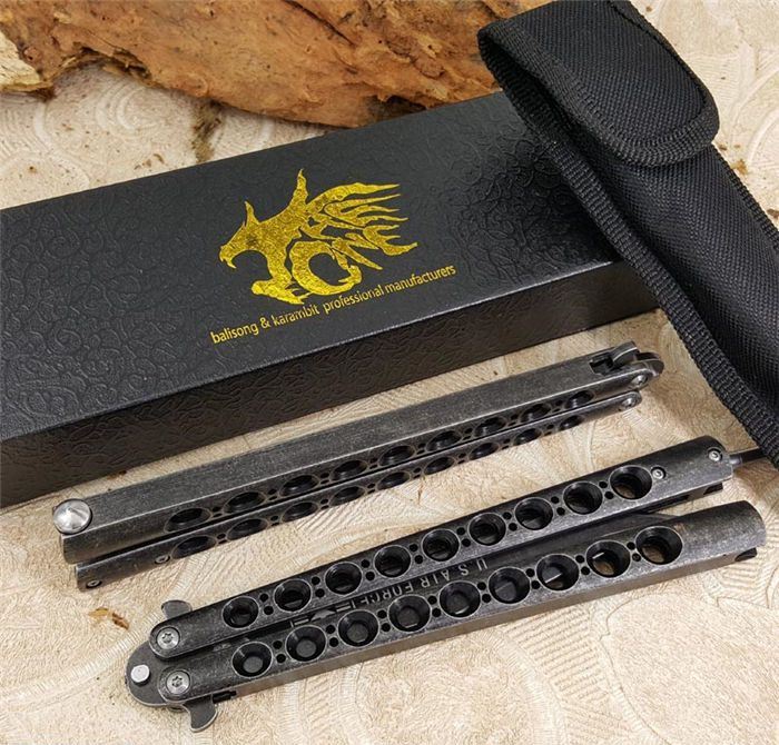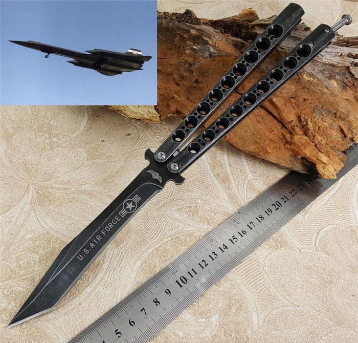 军标The One 黑鸟II一体柄蝴蝶甩刀全黑石洗 全长:29cm 刃长:13.5cm 刃厚:0.3cm 刃材料:440C黑石洗表面,超锋利 刃硬度:58 柄材料:不锈钢一体, 全黑石洗版本 重量:200克 刀鞘:尼龙套 附送theone 原装盒 军标theone 29CM黑鸟大甩刀II, 由Theone (唯一)精工打造,灵感来自美国最神秘和科幻的高空侦察机D-21无人侦察机(Lockheed D-21)黑鸟!29CM超长款式,一体柄型,更坚固和耐摔,由THEONE 精心打造