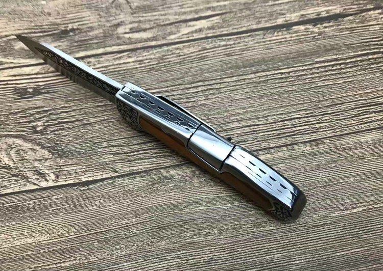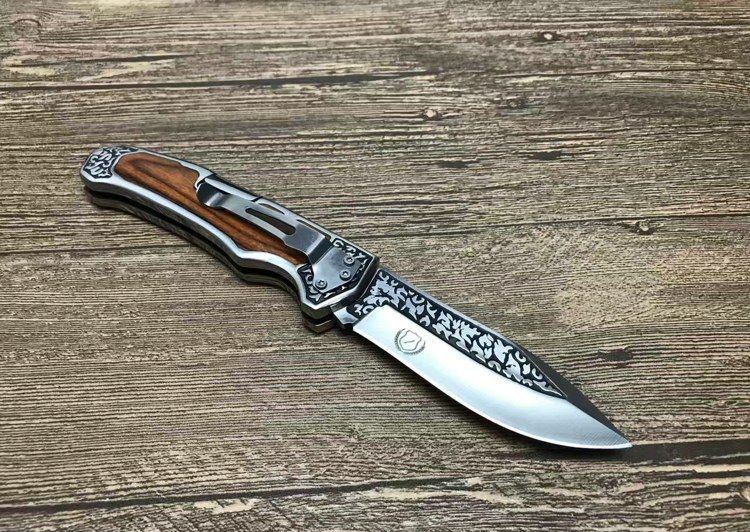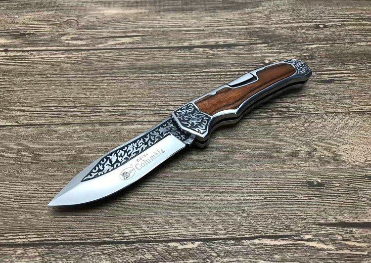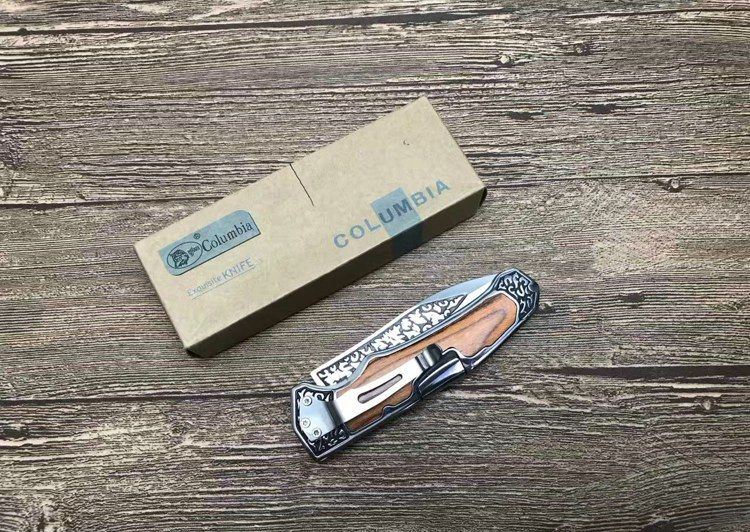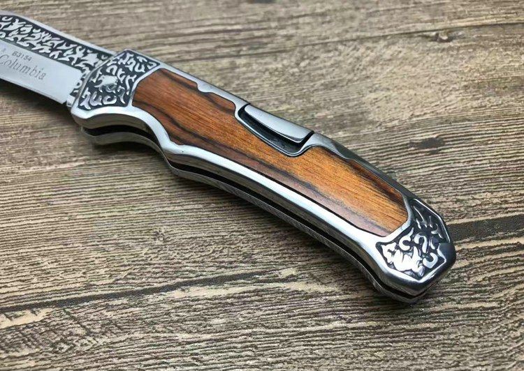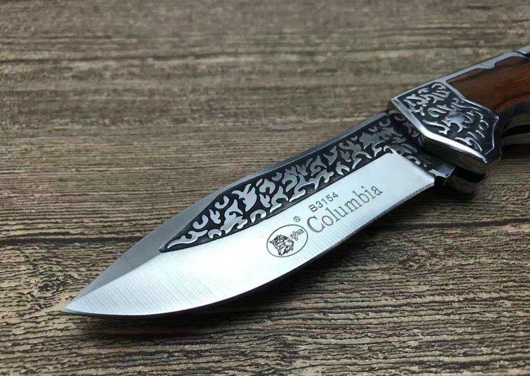 哥伦比亚B3154战术折刀 全 长:21cm 刃 长:9.5cm 柄 长:11.5cm 刃 宽:2.7cm 刃 厚:3mm 刃 材:7Cr13Mov 硬 度:56HRC 表 面:拉丝 柄 材:全钢雕花+彩木 重 量:206g(含包装) 锁 型:安全锁 包 装:纸盒 备 注:带腰夹