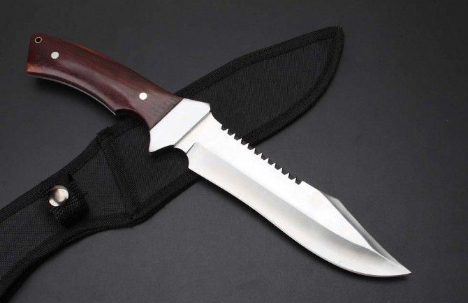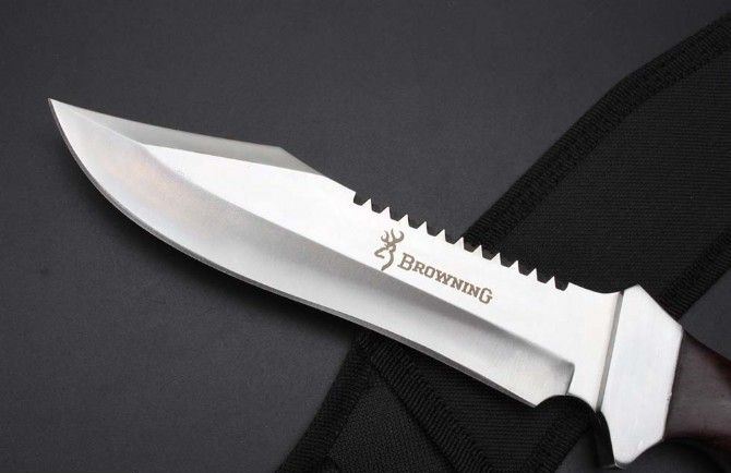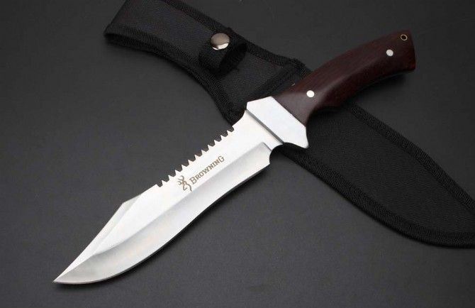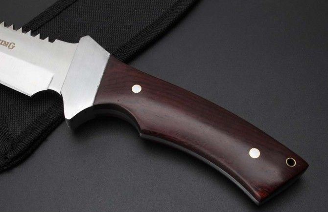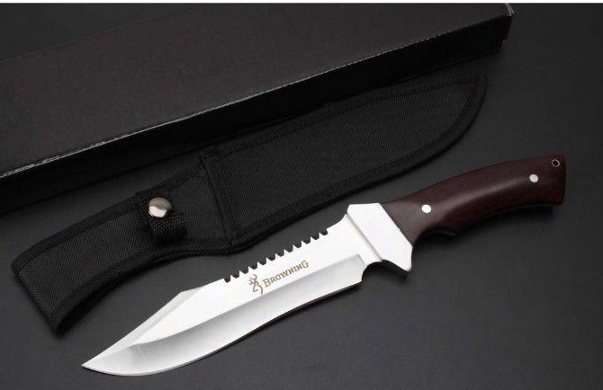 勃朗宁丛林之王直刀 全 长:32.8cm 刃 长:18.5cm 刃 厚:0.43mm 刃 宽:4.2cm 柄 长:14.3cm 刃 材:440 刀 重:440克 总 重:551克 表 面:精细沙光 柄 材:老树红酸枝木 硬 度:58CHR 刀 鞘:尼龙套 包 装:原厂礼品盒