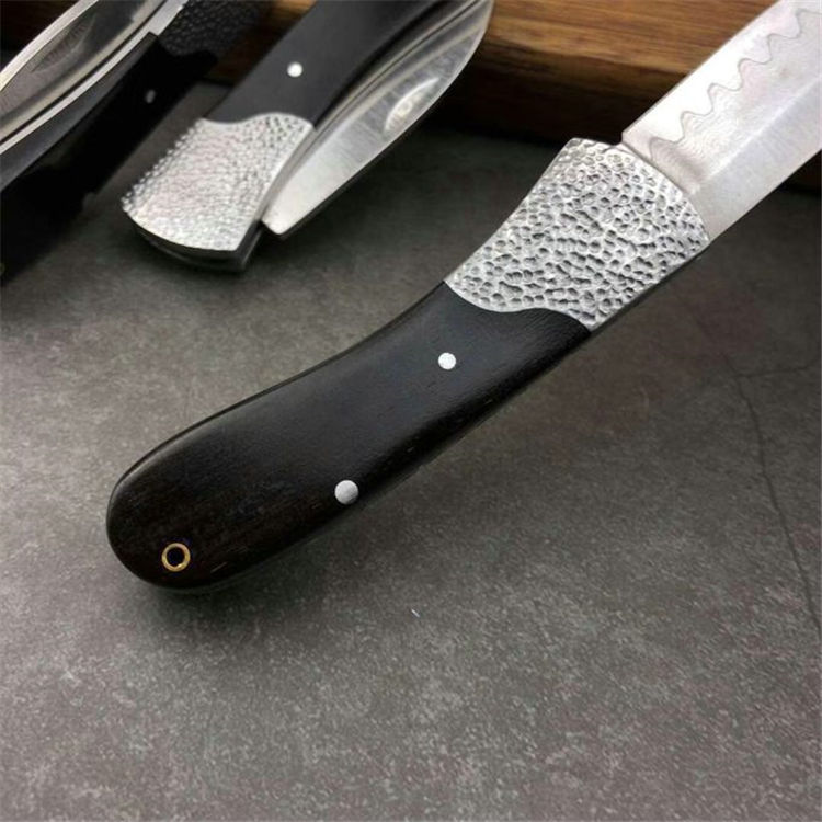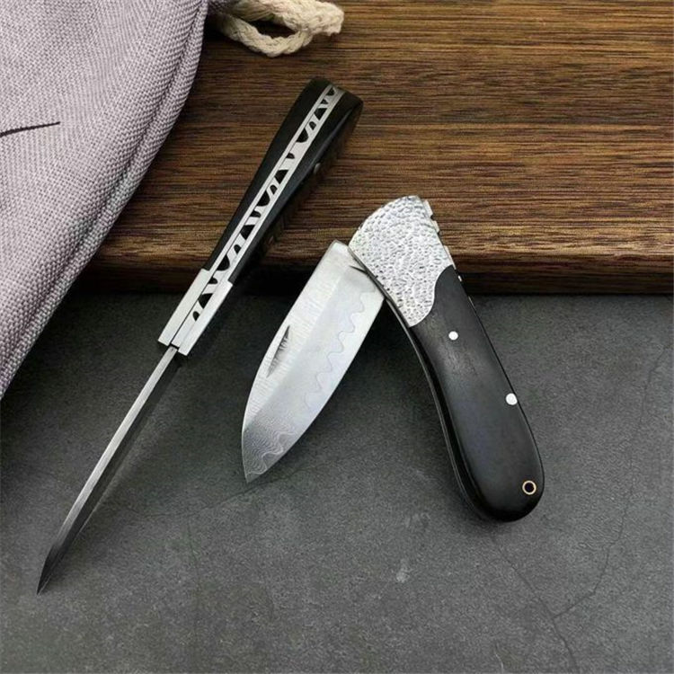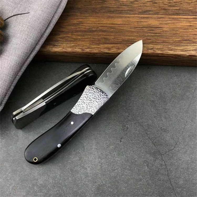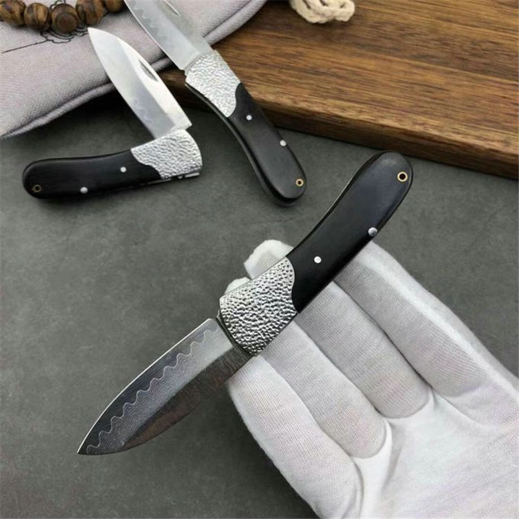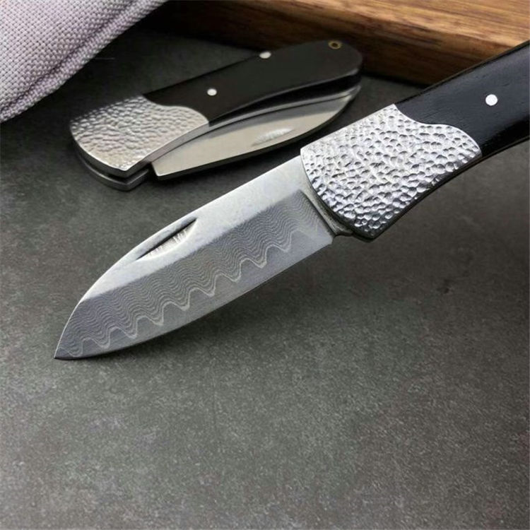 银河大马士革折刀 全长:14cm 刃长:6.5cm 刀刃:大马士革钢 厚度:2mm 硬度:59HRC 手柄材料:锻打凹凸钢头+黑檀木