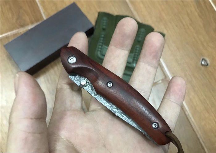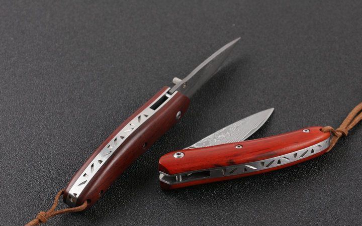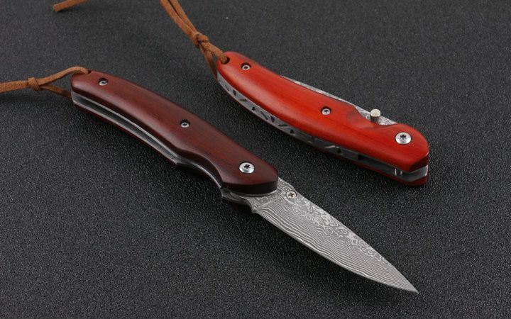 大马士革小科特折刀 全长:16cm 刀刃:6.6cm 刃厚:0.23cm 刃宽:1.7cm 柄长:9.4cm 硬度:58HRC 净重:145g(含包装物) 材料:VG10大马士革钢 柄材:钢片+天然微粒红檀木 锁型:线锁 包装:黑色高档木盒