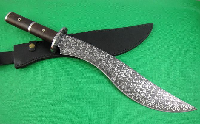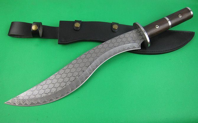 刀奴月牙狗腿 全 长:560mm 刃 长:360mm 柄 长:165mm 刃 宽:65mm 刃 厚:5.9mm 刃 材:5Cr13Mov 重 量:1490g(含包装) 硬 度:57HRC 表 面:腐蚀纹 柄 材:钢+黑檀木 其 他:配皮套