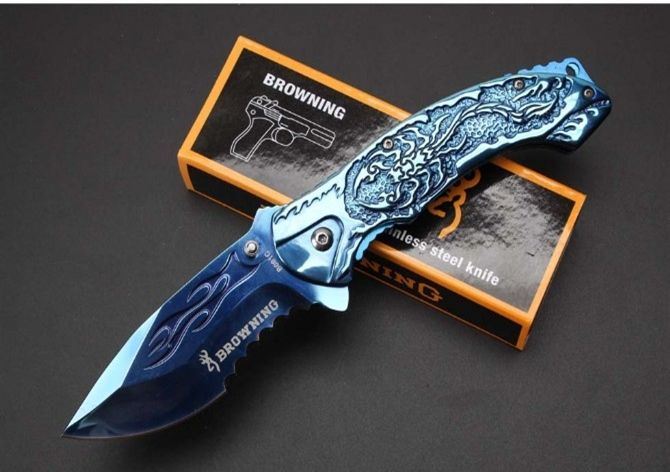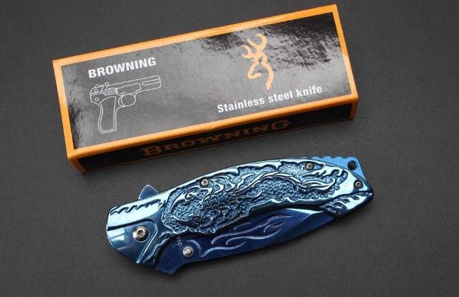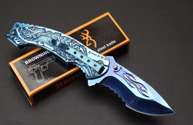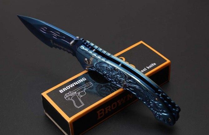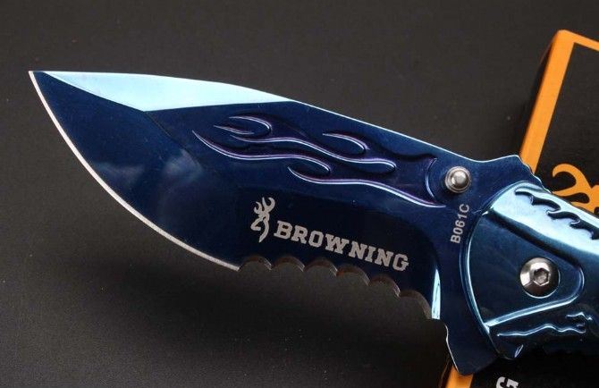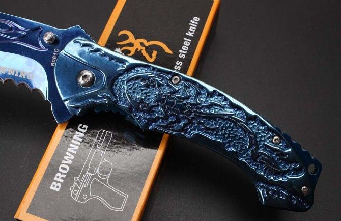 勃朗宁B061蓝钛快开折刀 全 长:20.8cm 刃 长:9.1cm 柄 长:12.1cm 刃 宽:3.3cm 刃 厚:2.8cm 刃 材:440 重 量:226g(含包装) 硬 度:58HRC 表 面:蓝钛 柄 材:全钢扎花 锁 型:侧锁 其 他:彩盒
