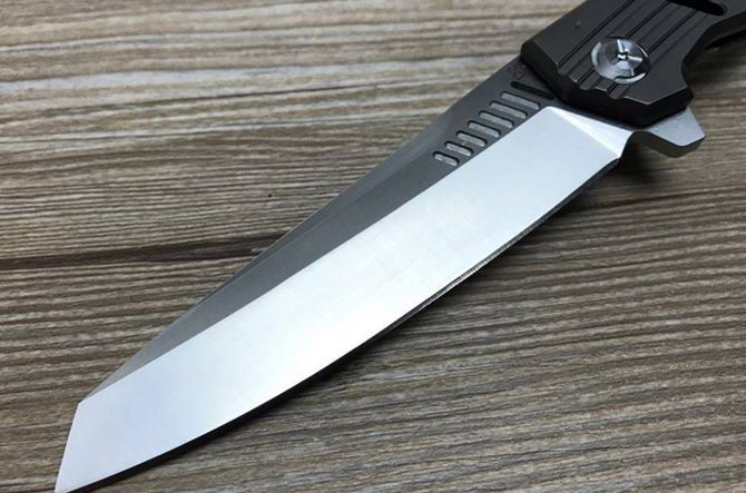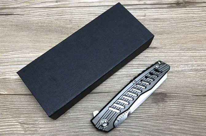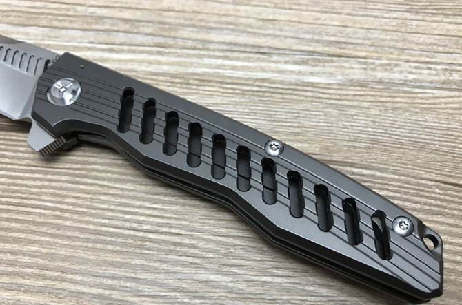 D2钢穿梭者折刀镀钛柄 全 长:22cm 刃 长:9.5cm 柄 长:12.5cm 刃 宽:2.5cm 刃 厚:3.6mm 刃 材:D2钢(精细沙光处理) 刀 重:130g 总 量:200g (含包装物) 硬 度:58-59HRC 表 面:手工磨沙 柄 材:喷沙拉丝.钛柄 刀 夹:超弹力钛夹 锁 型:线锁 螺 丝:所有螺丝420不锈钢硬度HRC45,全CNC精雕加工,内置轴承 结 构:线锁 锋利