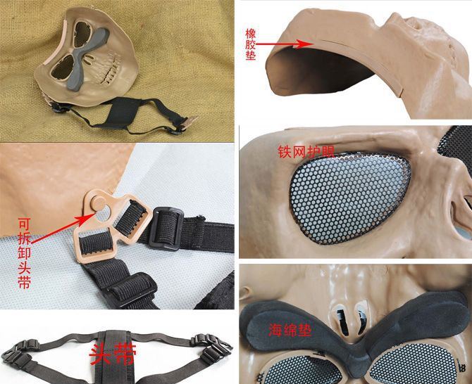骷髅战士防护面具(卡其/枯骨/铁黑/军绿色) 【尺寸】约宽19x高15厘米 【颜色】枯骨色 / 铁黑色 / 卡其色 / 军绿色 【净重】180克 【尺码】均码 备注:铁黑色和枯骨色因为是采用渲染喷漆,所以每一个面具的颜色都存在色差,产品颜色以实物为准,请亲们慎拍!如有疑问,请联系客服!