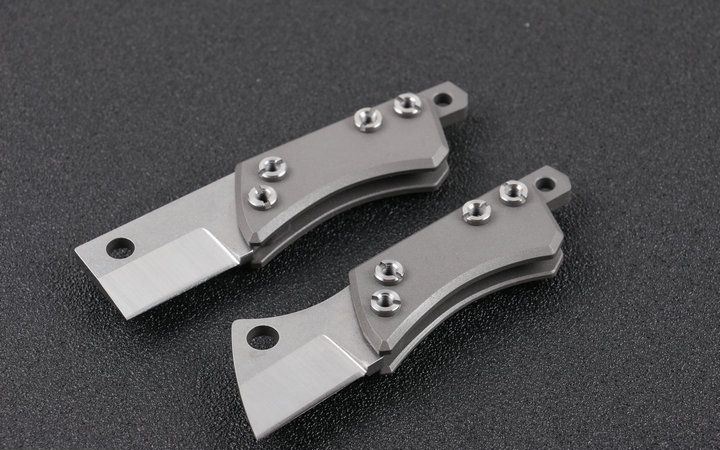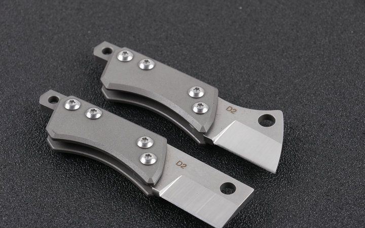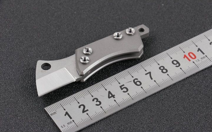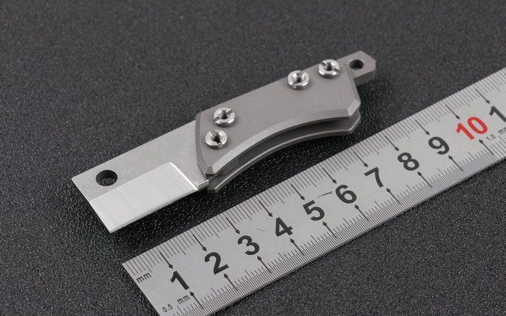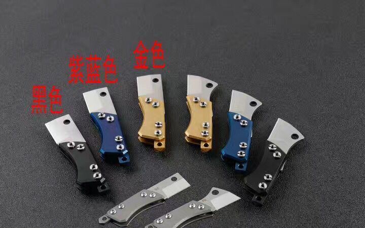 钛柄小菜刀两款式 全 长:9cm 刃 长:3cm 柄 长:6cm 刃 宽:2.1cm 刃 厚:3.2mm 刃 材:D2(精细沙光处理) 刀 重:45g 总 量:75g (含包装物) 硬 度:58-60HRC 表 面:手工磨沙 柄 材:正反面CT-4钛柄 刀 夹:无刀夹 锁 型:无锁 螺 丝:所有螺丝420不锈钢硬度HRC45,全CNC精雕加工,内置纯铜 结 构:内置玻璃撞击器,用于应急救生