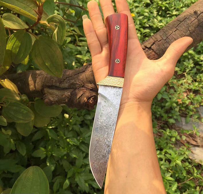 火凤凰大马士革直刀 全长:25cm 刃长:14cm 手柄长:11cm 刀刃钢材:进口大马士革钢VG10(高硬度)一体钢(深度冷热处理) 钢材厚度:3.2mm 硬度:60+HRC 手柄材料:纯黄铜护手锻打凹凸粒保留+鲜红柯檀木 包装配置:高档礼品盒+手工意大利牛皮刀套