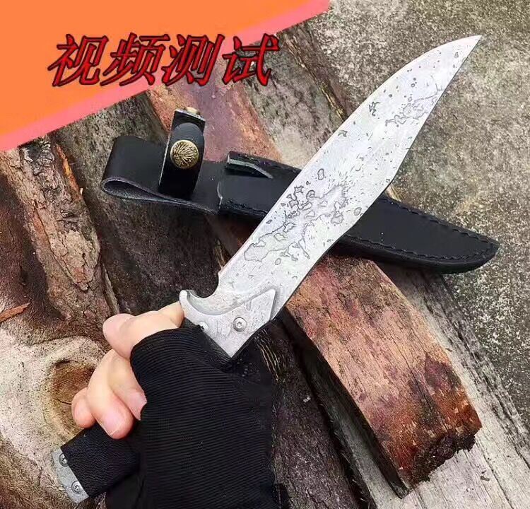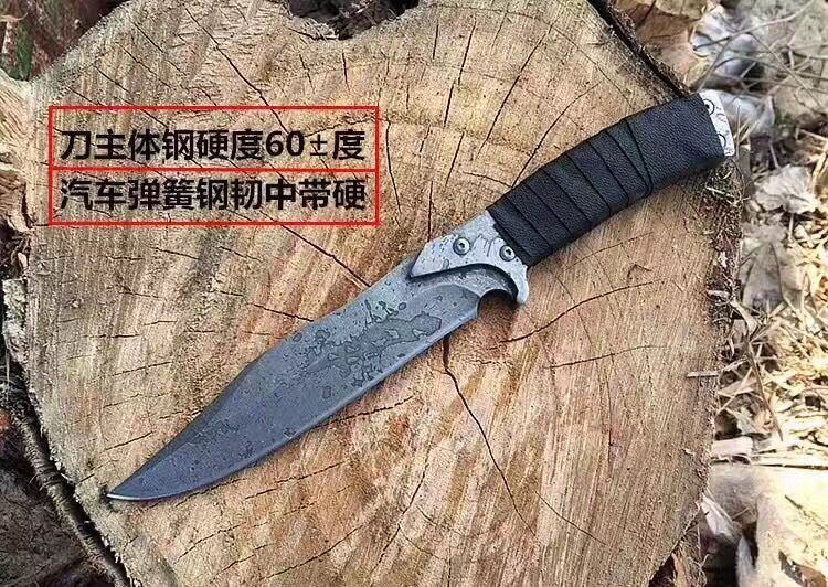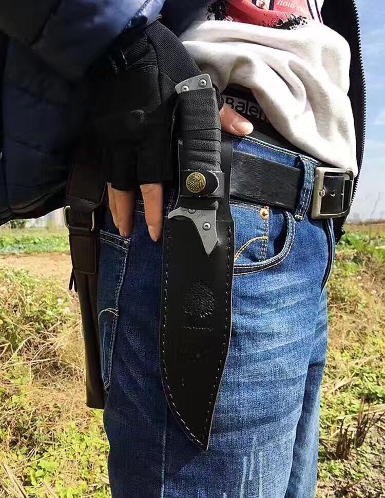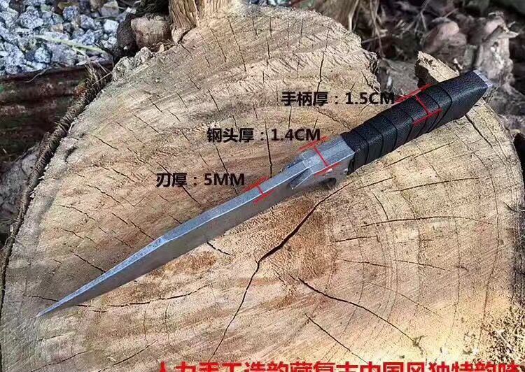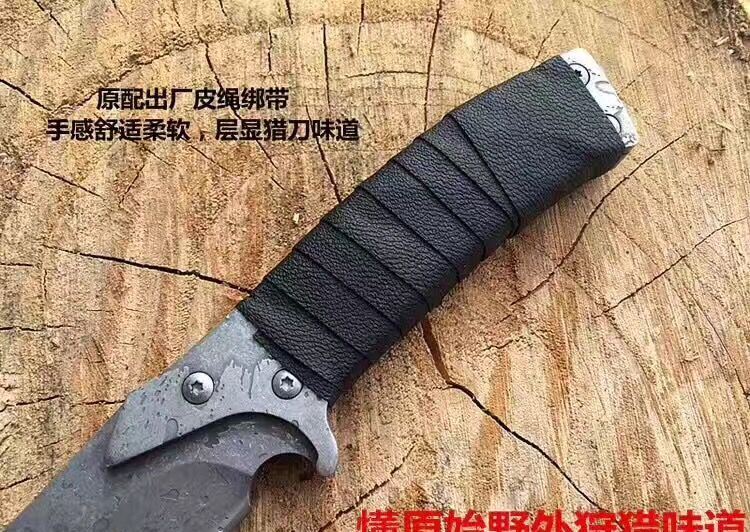 重罪犯中型匕首 全长:27CM 柄长:12CM 硬度:60HRC 刃厚:5MM 刃宽:3.2CM 刃材:弹簧钢 柄材:一体成型卷皮 表面处理:石洗+石刻处理 净重:290克 配真皮套