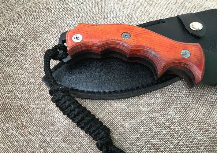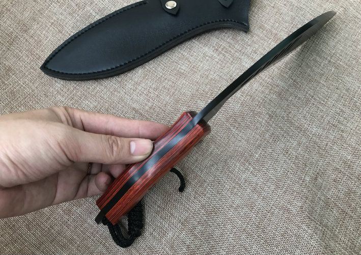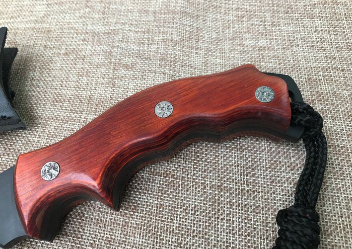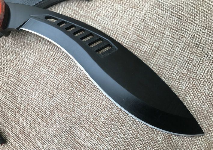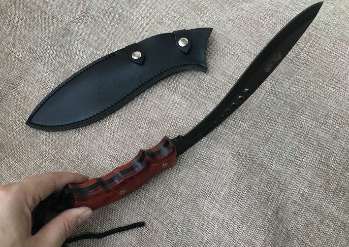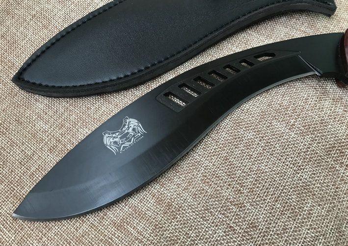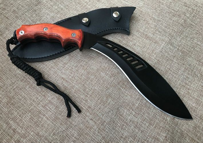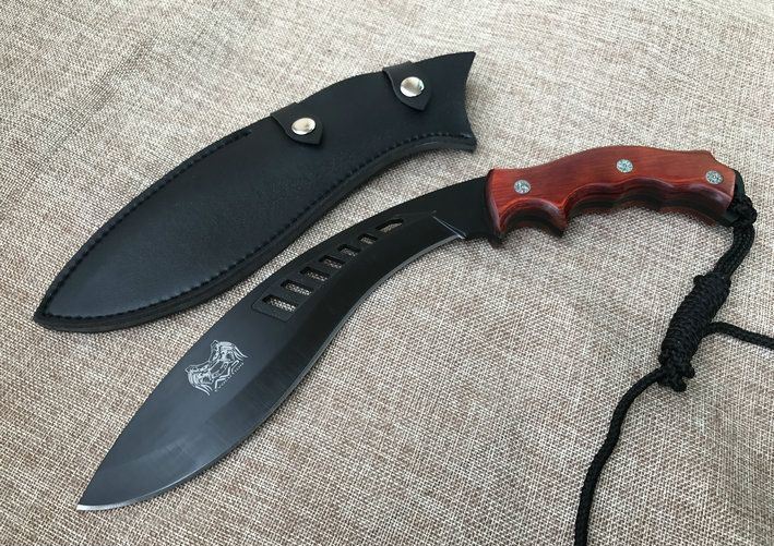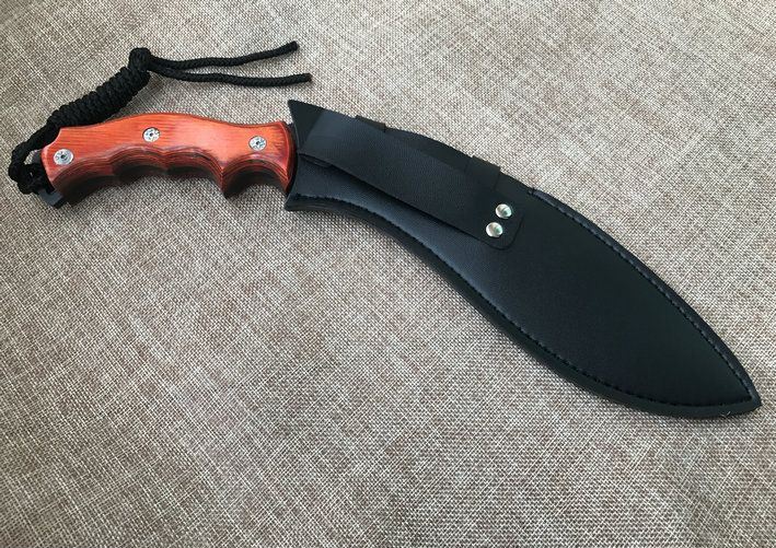 廓尔喀森林狼尼泊尔狗腿刀 全 长:34cm 刃 长:21.5cm 刃 宽:4.6cm(最宽处) 刃 厚:6mm 柄 长:12.5cm 表 面:镀钛 刃 材:9CR18MOV 硬 度:59HRC 柄 材:小叶檀木 结 构:龙骨一体 重 量:约450克