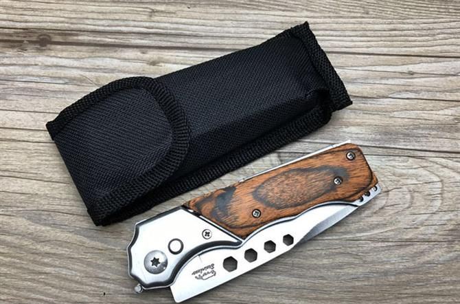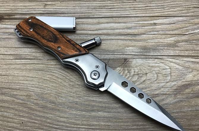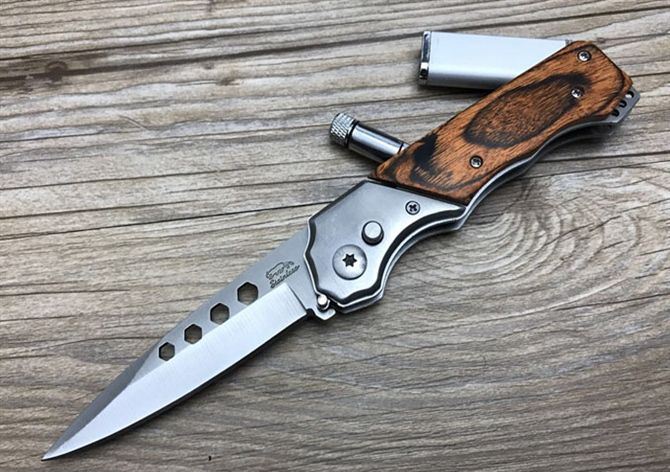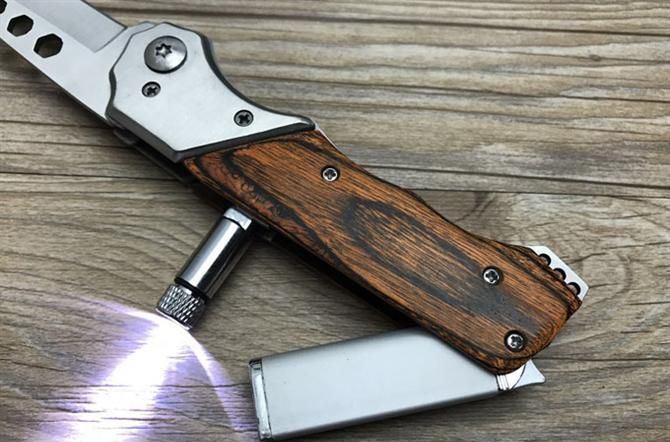 三合一多功能跳刀 全 长:200mm 刃 长:90mm 柄 长:110mm 刃 宽:20mm 刃 厚:20mm 刃 材:3Cr13Mov 重 量:200g(含包装) 硬 度:57HRC{真空热处理) 表 面:沙光 柄 材:钢-彩木 刀 鞘:尼龙