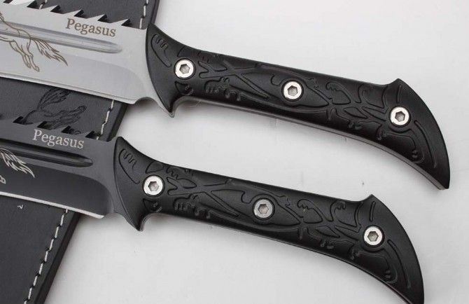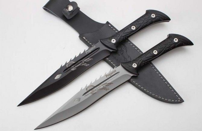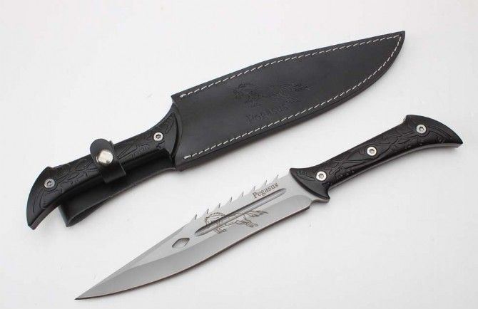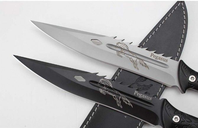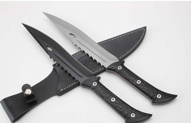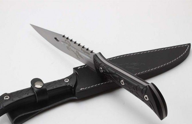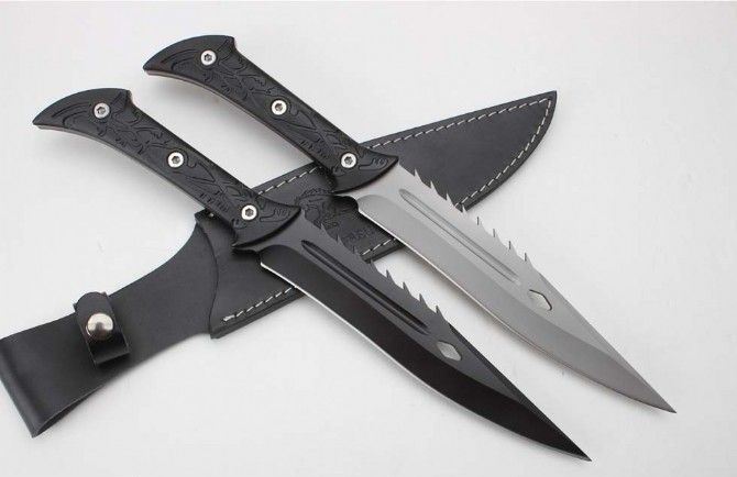 彪马军刀两色 全长:35.5cm 刃长:23cm 柄长:12cm 最宽处:5.5cm 刃厚:0.6cm 重量:560g 配送牛皮套
