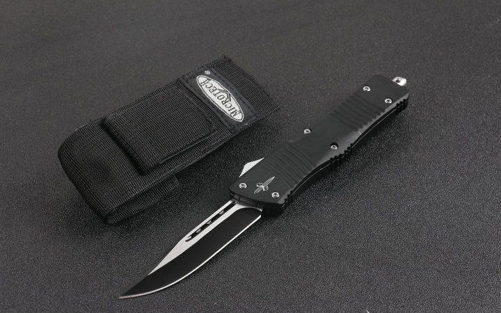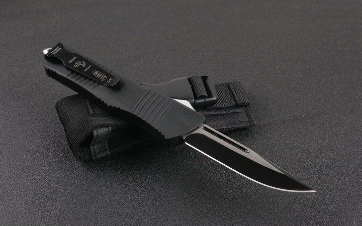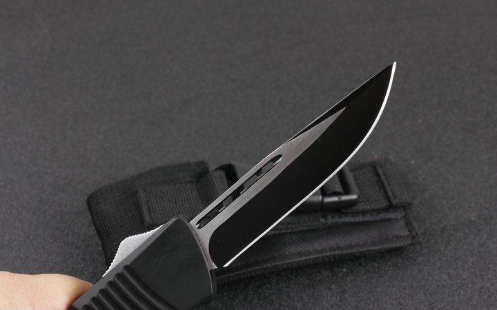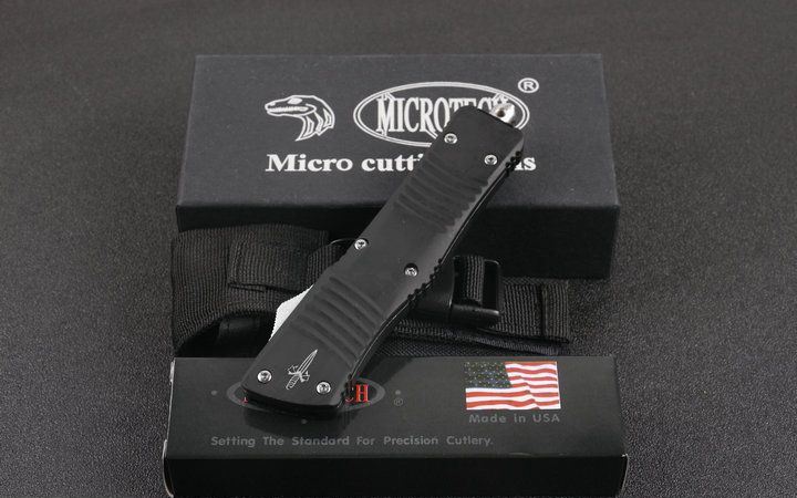 微技术伤齿龙FB01单锋直出刀D头 开启长度:23.5CM 合起长度:14.8CM 刃 厚:0.3CM 硬 度:57 HRC 刃 材:440c 表 面:发黑伴拉丝 把 手:航空铝合金+橡塑 净 重:233克(整刀) 毛 重:350克(含包装物) 开 合:双动作,直推开关,自动弹出和收回(刀头比较牢固,只有很轻微的摇动) 包 装:耐磨专用战术尼龙套 口袋刀夹:弹簧刀夹 玻璃敲击器:钨质玻璃敲击器