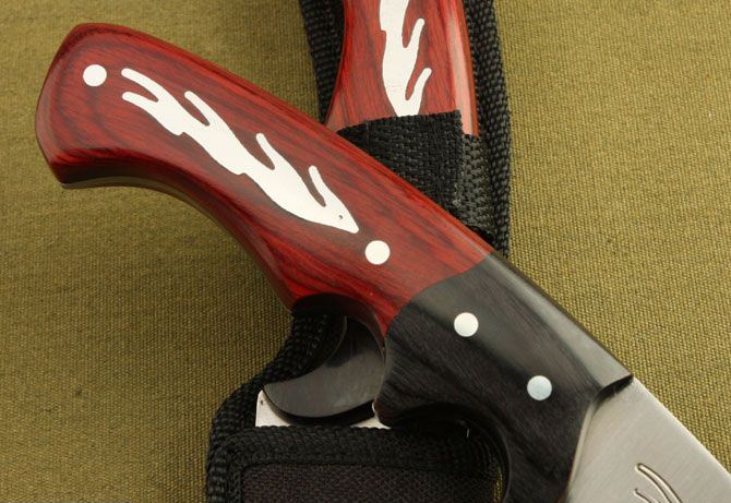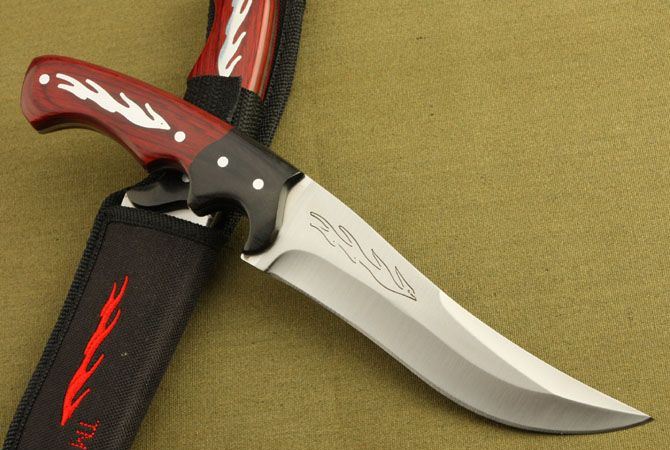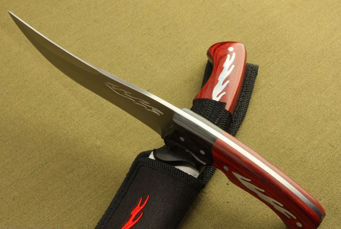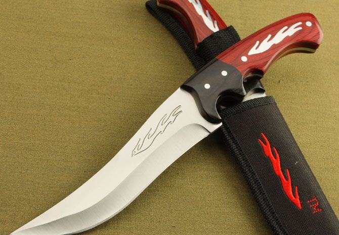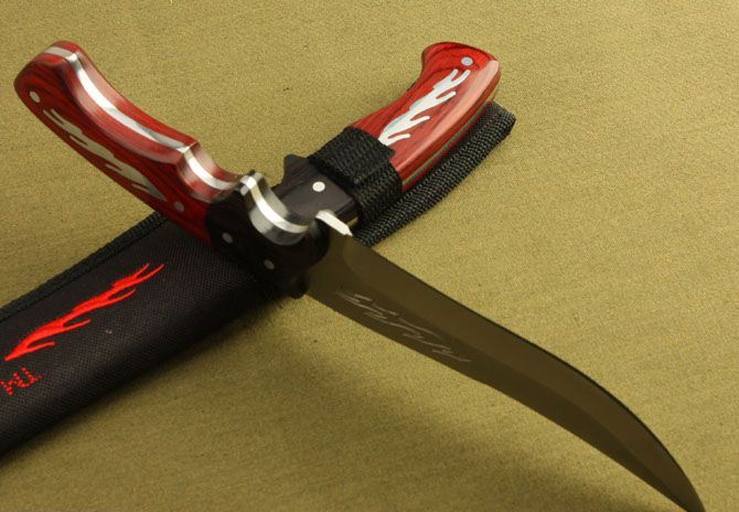 F16飞鸟直刀 全长:27.5cm 刃长:15cm 柄长:12.5cm 刃厚:3.4mm 重量:260g(含包装) 刃材:3Cr13 硬度:55HRC 表面处理:砂光 柄材:彩木