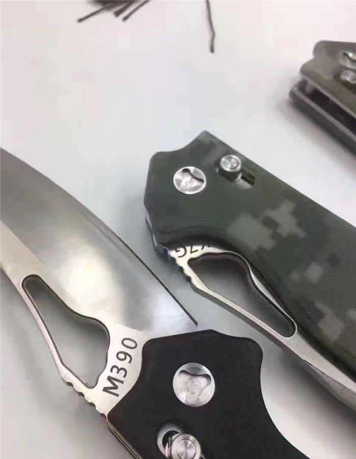 微技术M390折刀 全 长: 21cm 刃 长: 9.7cm 刃 宽: 2.8cm(最宽处) 柄 长: 12cm 硬 度: 58-60HRC 刃 厚: 0.30cm 重 量: 约95克 刃 材: 正品M390革钢 柄 材: 迷彩+G10